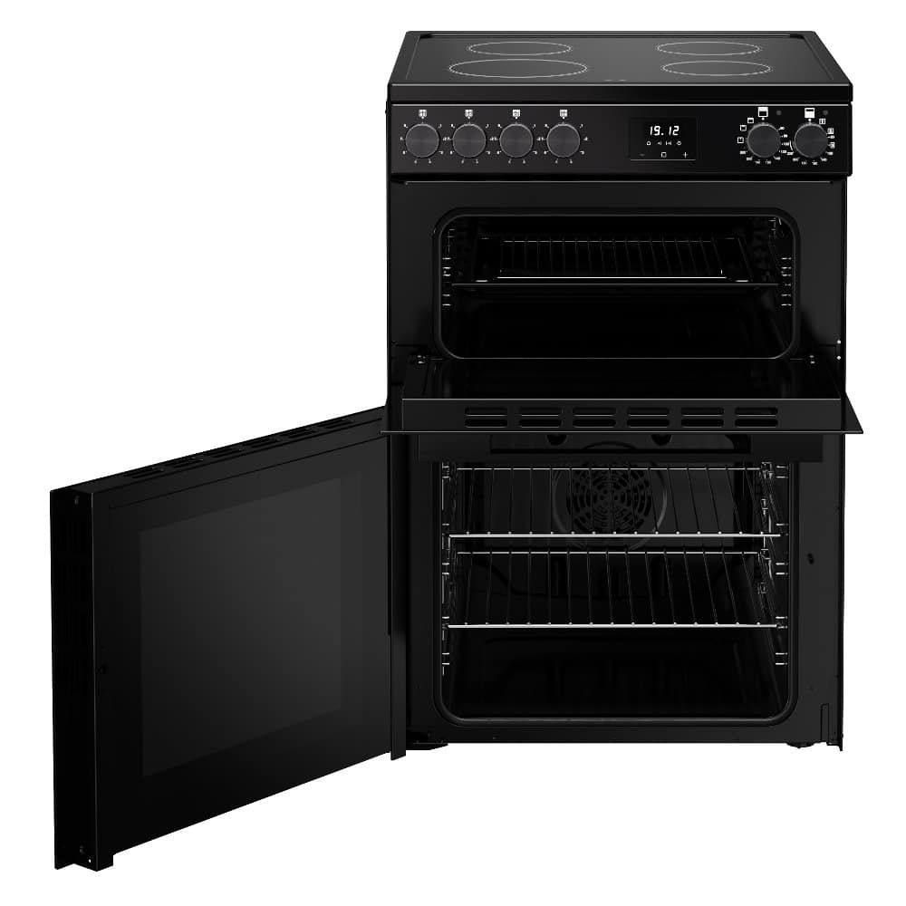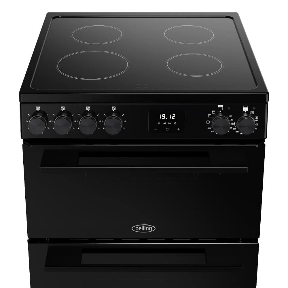 This attractive 60cm wide freestanding cooker in stunning black from Belling features a fanned electric main oven, a conventional electric second oven with grill and a four zone induction hob.