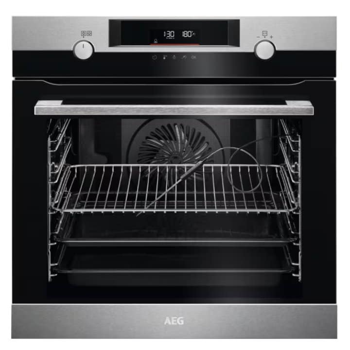 Perfect for aspiring chefs, this multifunction single oven from AEG provides a 71 litre cooking capacity and a smart food probe that measures the core temperature of meats and various other dishes. Fitted with a quadruple glazed soft close door and anti-fingerprint stainless steel, the BPK556260M cooks any meal quickly and efficiently. With 9 cooking functions and a temperature range of 30°C-300°C, this oven offers endless possibilities! From grilling to baking, you’re sure to find the programme you need. Make your baked goods extra crispy by selecting the PlusSteam button at the beginning of the baking process. With AEG’s SurroundCook convection system, every dish will be cooked to perfection! Thanks to a pyrolytic cleaning mode, it is quick and easy to maintain your AEG oven. The pyrolytic function reduces grease and food reside to ash which can be wiped away with a damp cloth. With an enamel interior, halogen lights, an LED display and retractable rotary controls, transform your cooking with AEG!