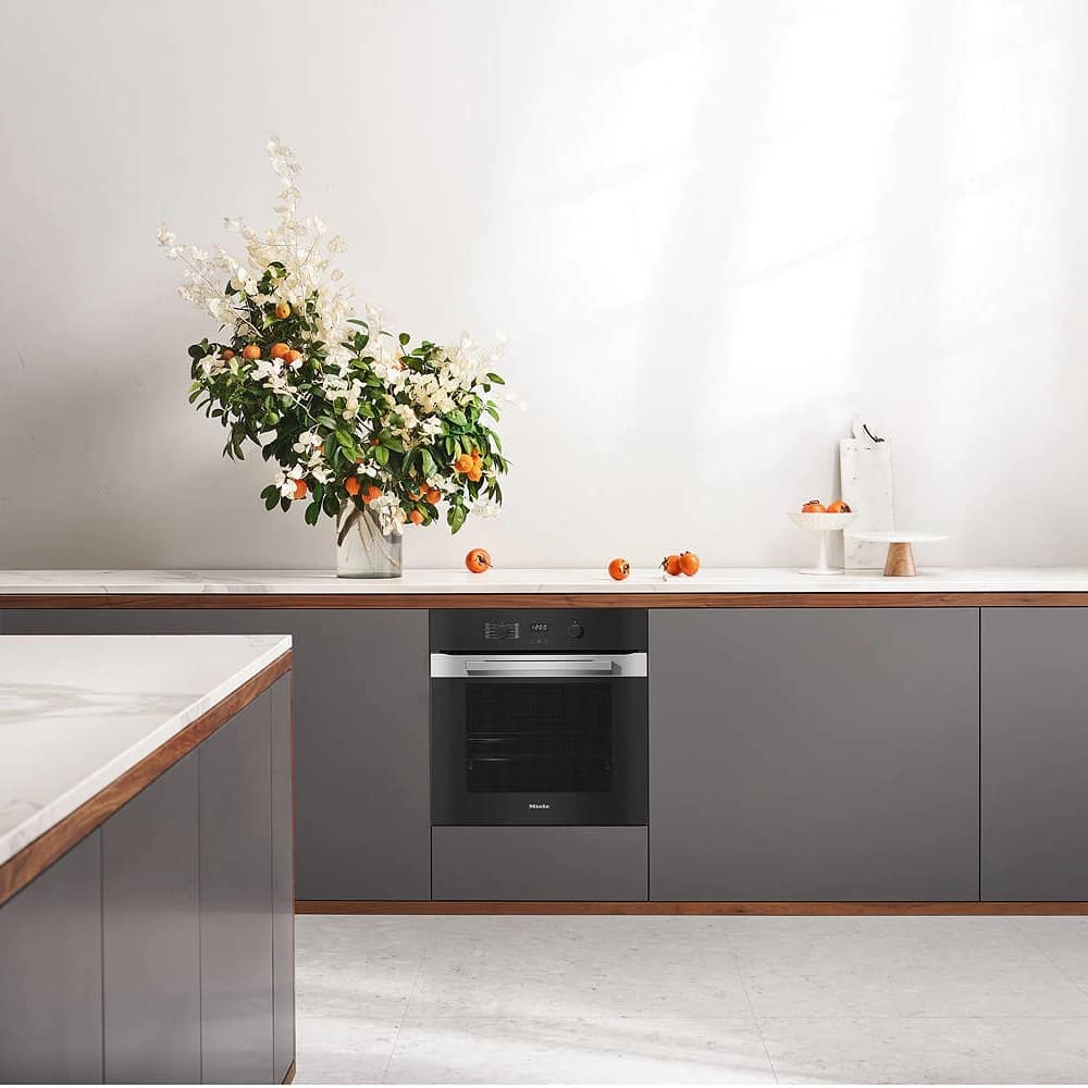 This superb built-in oven with catalytic liners from Miele has an LCD display with dial control for easy control and access. This model features Miele’s Touch-Cool technology; the multi-layer panels insulate the oven door effectively and ensure a lower temperature on the outside of the door, providing greater safety and protection, eliminating burns. Perfect if you have wandering little hands and fingers around the kitchen! Finished in Clean Steel this oven, teamed up with other PureLine appliances, will look fantastic in your kitchen.