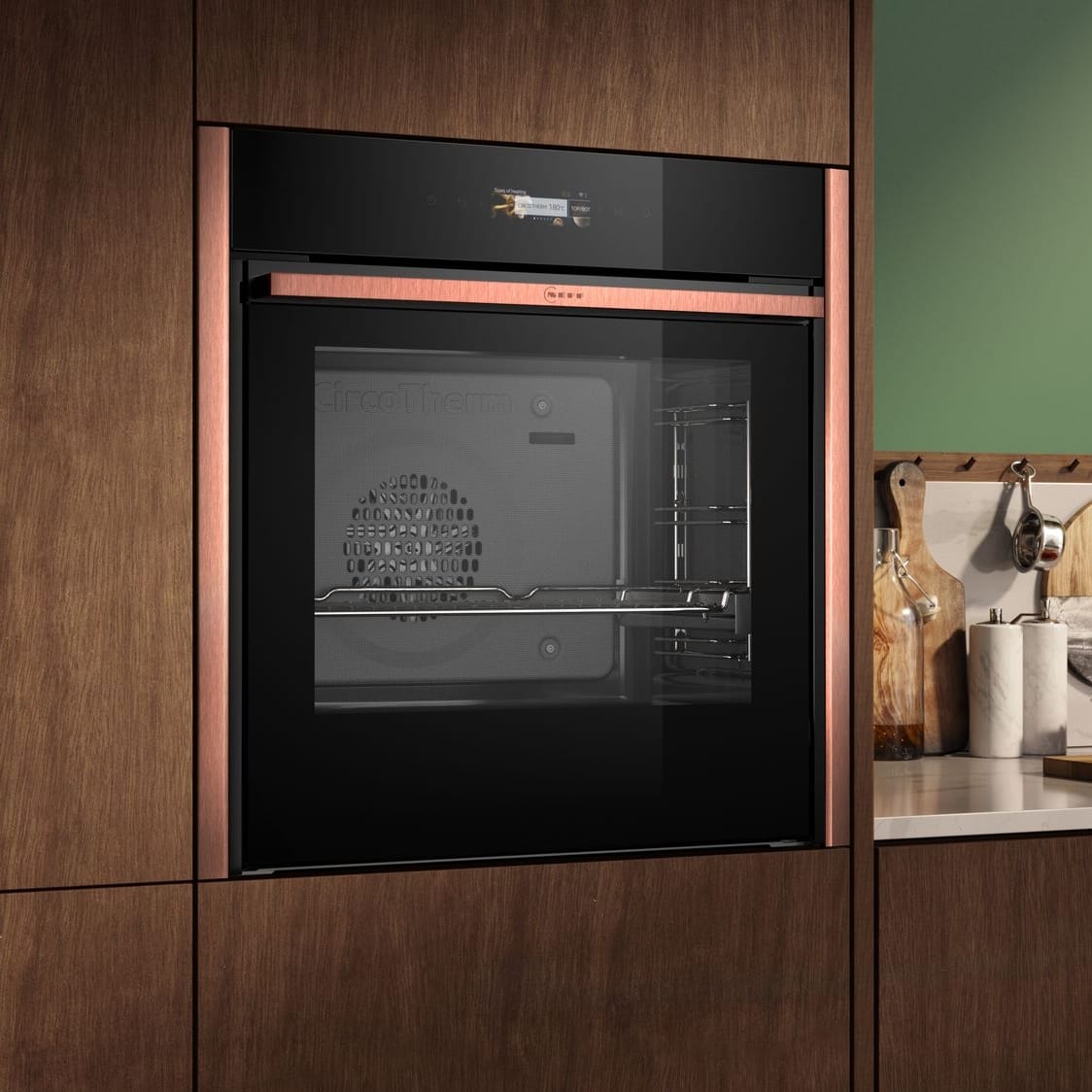 We love this fantastic Neff Flex Design Slide & Hide pyrolytic single oven, with its 71 litre capacity, loads of cooking functions and sensational looks. Neff’s unique Slide&Hide disappearing door retracts smoothly under the oven cavity, allowing plenty of room for manoeuvring and easier access into the oven. It features Neff’s amazing CircoTherm technology for even cooking at all levels with no transfer of smells or flavours. Wave goodbye to scrubbing the inside after you’ve finished baking with the brilliant Pyrolytic function, burning away any residue so all it needs is the simplest wipe down. There is lovely LED lighting inside to give you a perfect view of your cooking. Controlling all the functions couldn’t be easier with a state of the art TFT touch control panel. You will feel well and truly spoilt by Neff with this fantastic oven. Finished in black with a choice of trim colours available it creates a stylish streamlined look and is easy to keep clean.