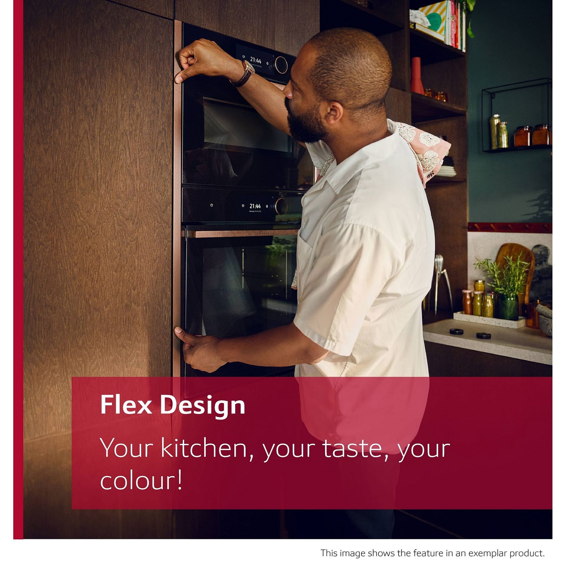 We love this fantastic Neff N90 Flex Design Slide & Hide Pyrolytic single oven, with its 71 litre capacity, loads of cooking functions, VarioSteam and sensational looks. Neff’s unique Slide&Hide disappearing door retracts smoothly under the oven cavity, allowing plenty of room for manoeuvring and easier access into the oven. It features Neff’s amazing CircoTherm technology for even cooking at all levels with no transfer of smells or flavours, whilst VarioSteam gives your dishes the perfect amount of moisture by adding steam at three intensity levels. Ideal for roasting, baking or just heating up! Wave goodbye to scrubbing the inside after you’ve finished baking with the brilliant Pyrolytic function, burning away any residue so all it needs is the simplest wipe down. There is lovely LED lighting inside to give you a perfect view of your cooking. Controlling all the functions couldn’t be easier with a state of the art TFT touch control panel and TwistPad Flex controls. You will feel well and truly spoilt by Neff with this fantastic oven. Finished in black with a choice of trim colours available it creates a stylish streamlined look and is easy to keep clean.