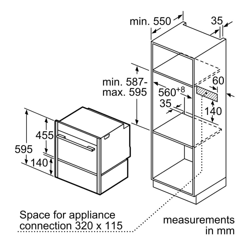Continous design strips for the seamless combination of a compact oven with a 140mm warming drawer