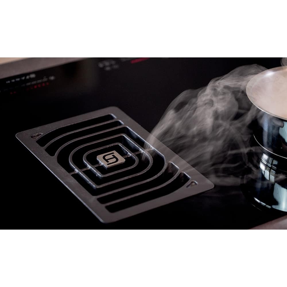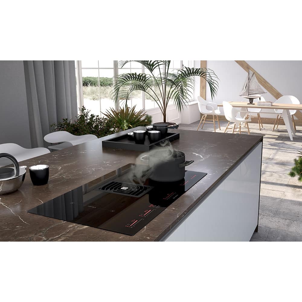 The superb Galileo air venting induction hob from Faber combines cooking and extraction in one unit! You can cook away on the bridgeable induction zones, combining them from 4 zones to 2 larger zones for bigger pans if you need, whilst the built in central extractor draws away all the steam and odours. Offering extraction rates of up to 700m³ per hour it will easily draw away aromas, so you can concentrate on what you’re cooking!