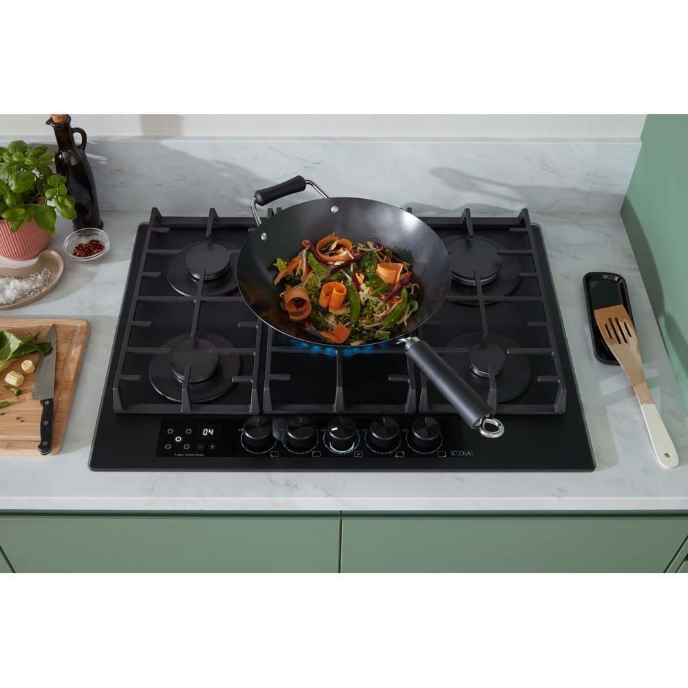 This fantastic gas hob from CDA looks amazing, with its black gas on glass finish and cast iron pan supports. There are 5 gas burners, including a wok burner, so you have plenty of options whether you need to boil, fry or simmer.