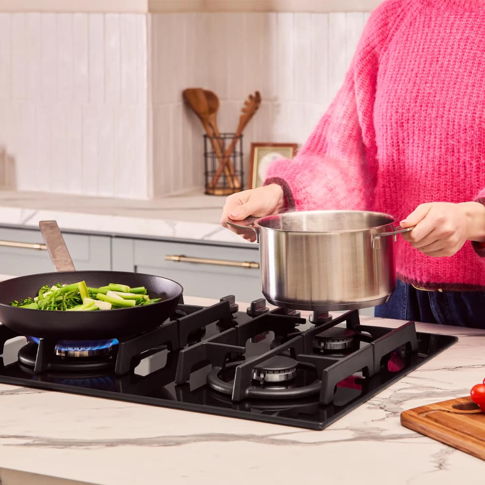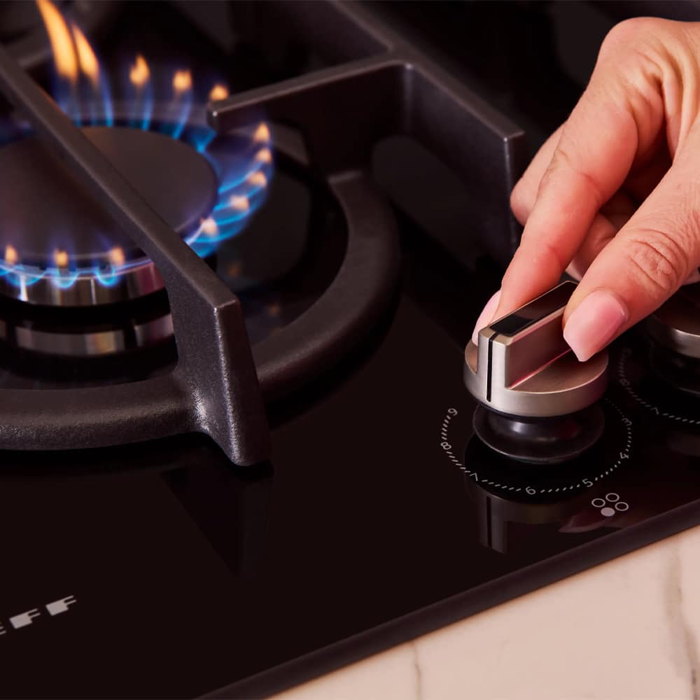 With a stylish black glass finish and cast iron pan supports, this distinctive four burner gas hob from Neff looks fabulous. FlameSelect gives you complete control over your gas flame level. The flame adapts to any dish. Simply select one of 9 levels and you can see how the flame becomes larger or smaller depending on how you need it, just as easy as cooking on an electric hob! With easy to use control dials the T26PIP4S0 from Neff is hassle free.
