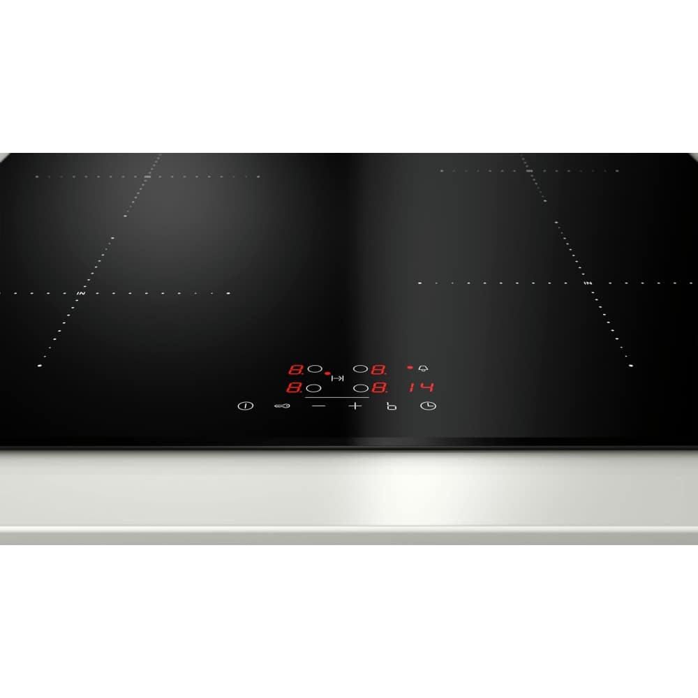 Superb energy efficient cooking from Neff! We love this black glass induction hob which boasts four heat zones, easy to use electronic touch controls and is suitable for a 13 Amp power supply. Induction cooking with the T36FB41X0G is the perfect time and energy saver, as with the automatic pan recognition, the base of the pan is the only area heated, which eliminates wasted heat and speeds up boiling. You’ll have peace of mind thanks to safety features such as the control panel lock and safety cut out facility and the added bonus of a 2 year warranty.