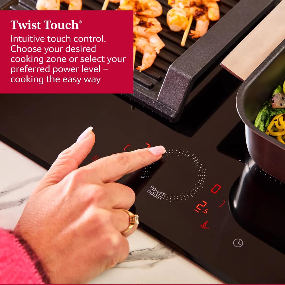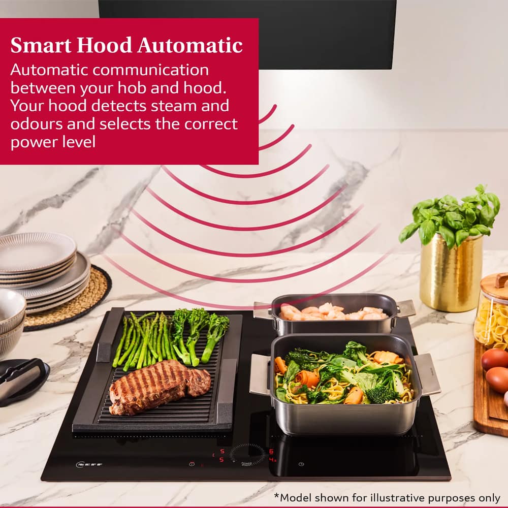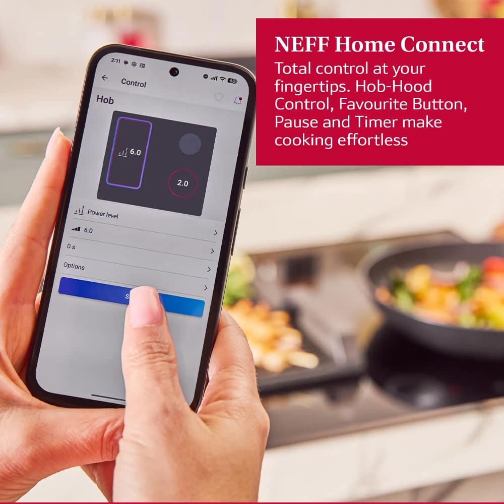 Quality, flexibility and style! That’s what you’ll find here in this superb induction hob from Neff. Featuring 4 induction zones, 2 of which can be combined to form a Flex Induction zone, this hob makes cooking, boiling and frying with different sized pans so easy. Flex Induction means ‘any pan, anywhere’ so no more juggling hot pans for hob space, the automatic pan recognition detects when there’s a pan on the surface and only heats that area. Finished in black glass with a bevelled front edge the T66FHE4L0 creates a stylish streamlined look and is easy to keep clean.