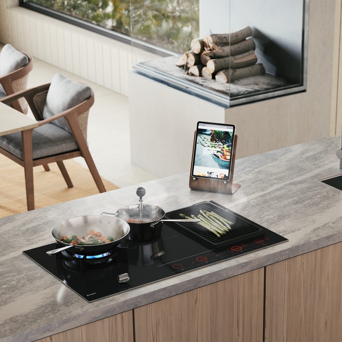 Asko have really excelled with this superb 90cm wide hob! Not only are there four induction zones with intuitive touch controls but also a gas wok burner with a cast iron pan support. With a black glass finish and stainless steel edge trim it not only offers brilliant, flexible cooking but looks amazing as well.