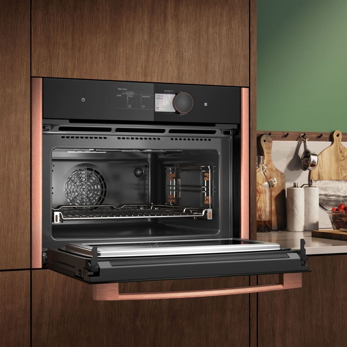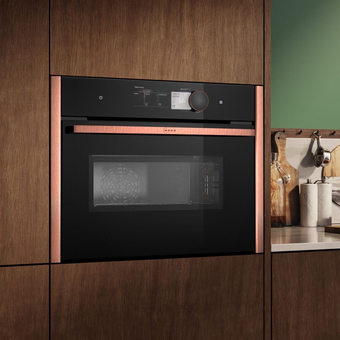 This superb N90 Flex Design 45 litre combination microwave from Neff is packed full of features so it does more than just warm your food! With loads of different heating modes you can cook up a storm! There is 4D Hot Air for even heat distribution, conventional, grill and dough proving for the perfect loaf. Wave goodbye to scrubbing the inside after you’ve finished cooking with the brilliant Pyrolytic function, burning away any residue so all it needs is the simplest wipe down. Finished in black with a choice of trim colours it creates a stylish streamlined look and is easy to keep clean.