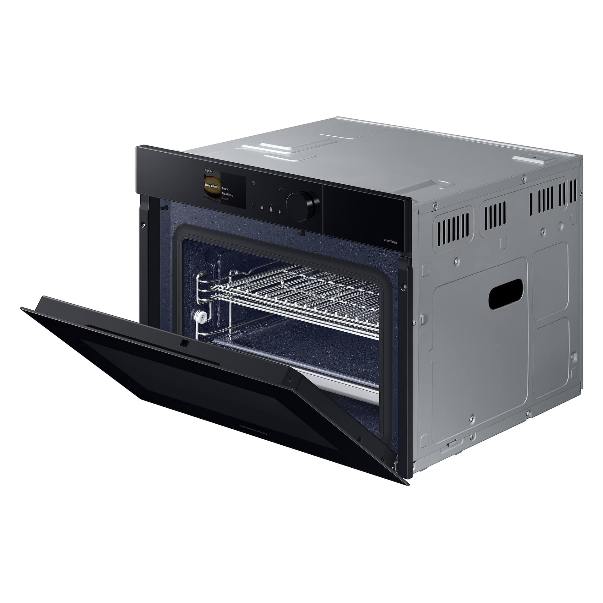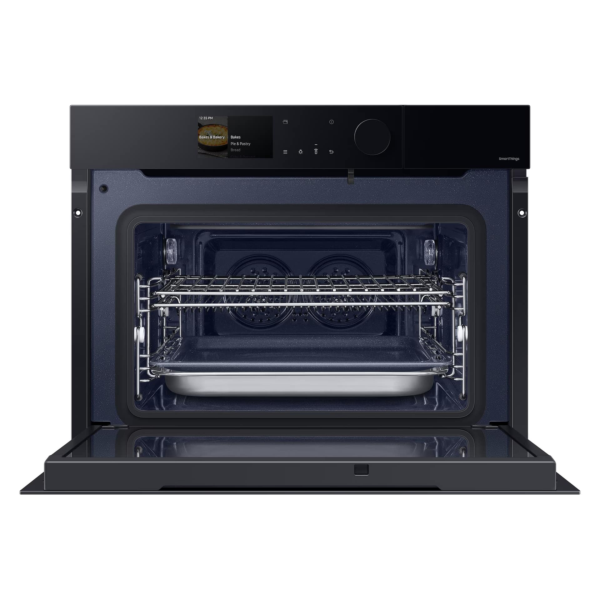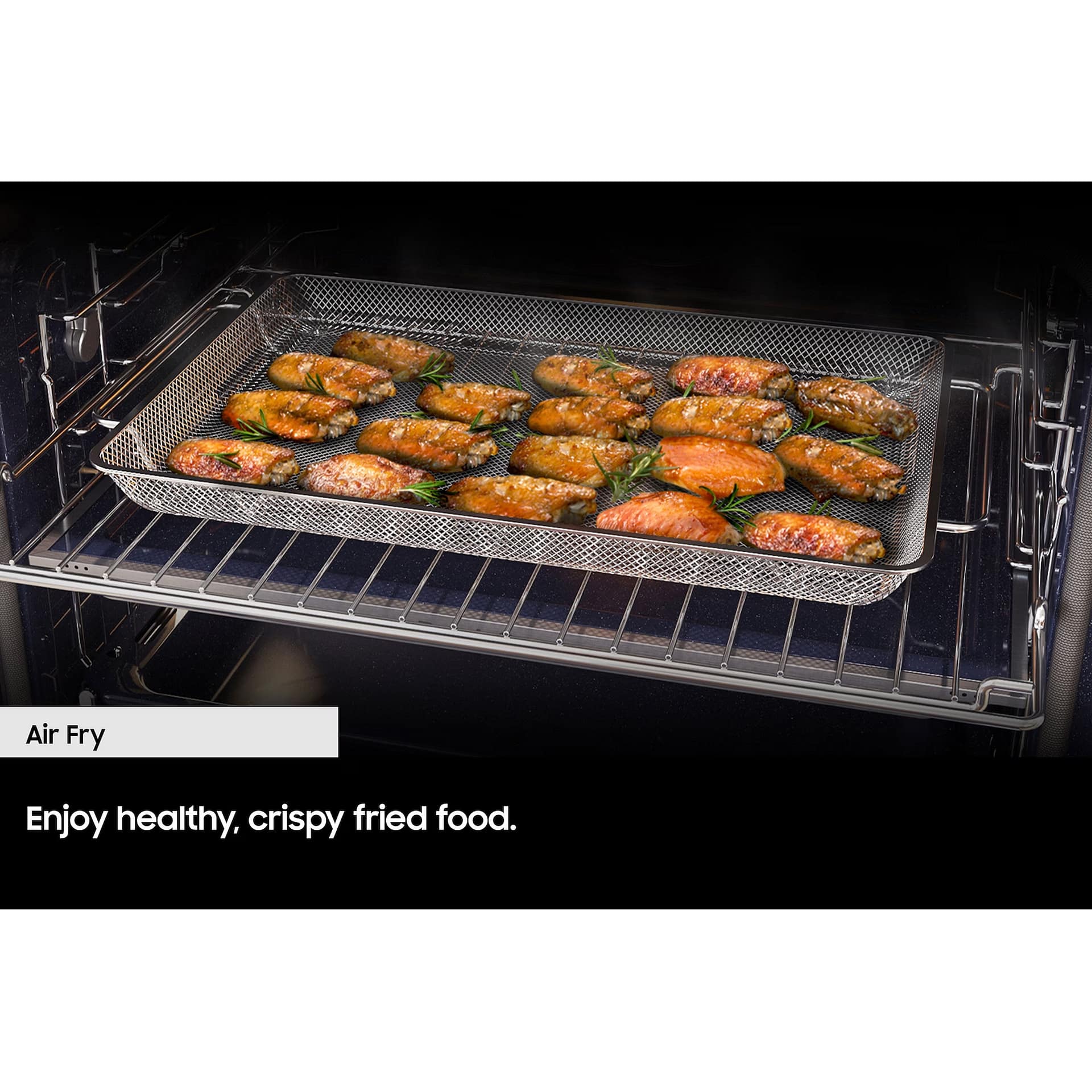 With a net capacity of 50 litres, cook and reheat meals of all shapes and sizes with this fantastic Samsung combi microwave! Made for a tall housing, the NQ5B7993AAK/U4 is finished in black and is the perfect companion to other Samsung kitchen appliances. Expand your culinary horizons with the NQ5B7993AAK/U4’s combination features, allowing you to cook, grill and defrost meals as you would in a standard convection oven. The microwave function reheats food quickly and evenly without the rotating plate you’ll find in most microwaves. The NQ5B7993AAK/U4 offers further versatility with its air frying mode, creating food that is crispy on the outside and deliciously moist in the inside. A special tray allows hot air to circulate your food, frying without deep frying. Select your preferred cooking function with the intuitive LCD display, touch controls and single knob. Wi-Fi connectivity lets you control your combi microwave from your phone. Preheat your oven or turn it off and adjust temperature or cooking time without leaving the sofa! The SmartThings app offers personalised recipe and can even help you build the perfect shopping list.