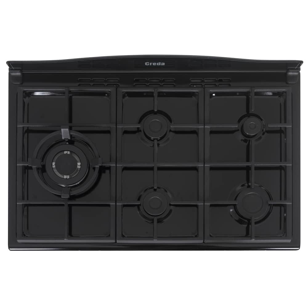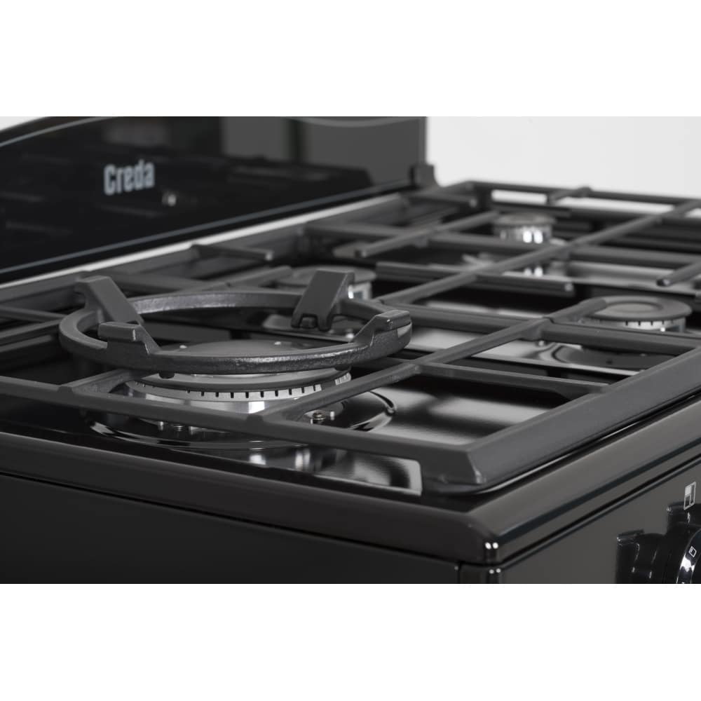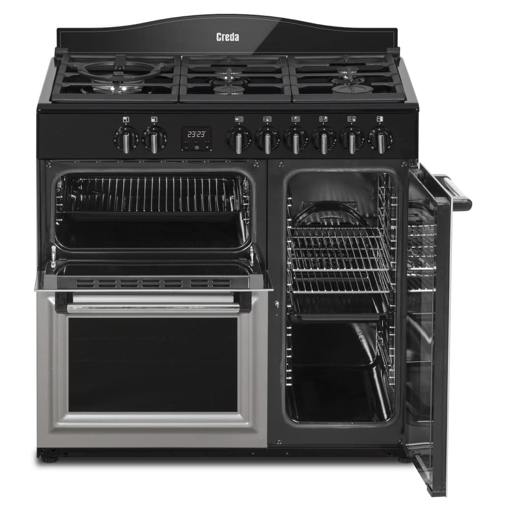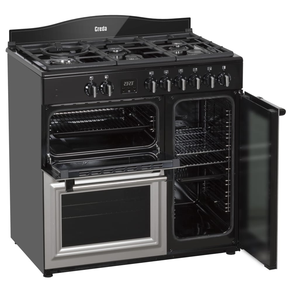 This 90cm wide Traditional dual fuel range cooker from Creda really serves up the style. Two electric fan ovens, a separate grill and a five burner gas hob with wok burner provide options and flexibility for every meal, from warming soup to creating a roast dinner and more. It is finished in silver and comes with a five year warranty for ultimate peace of mind.