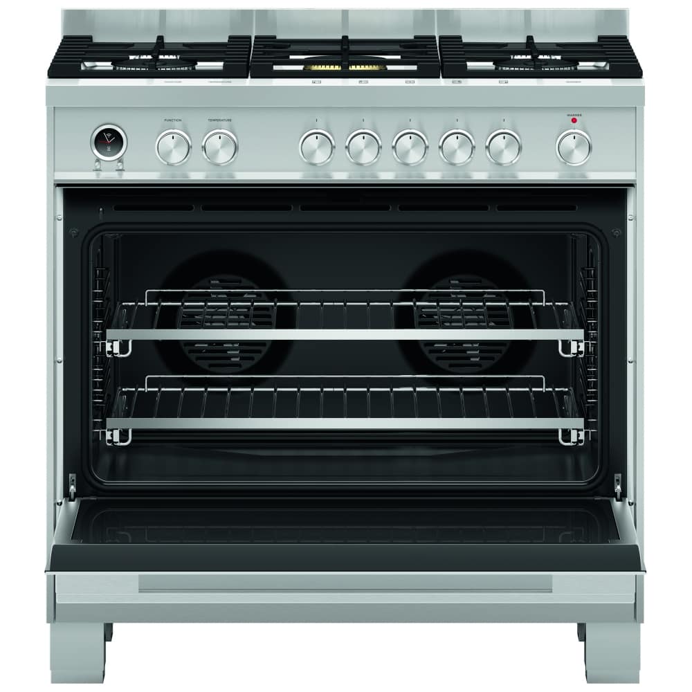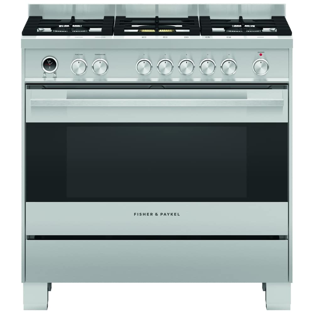 The Fisher & Paykel OR90SDG6X1 pyrolytic single cavity range cooker features a 5 burner gas hob and a 120 litre multifunction oven with an internal grill. There is also a full width variable temperature warming drawer at the bottom. The contemporary design and clean lines in stainless steel will complement the style and elegance of any modern kitchen.