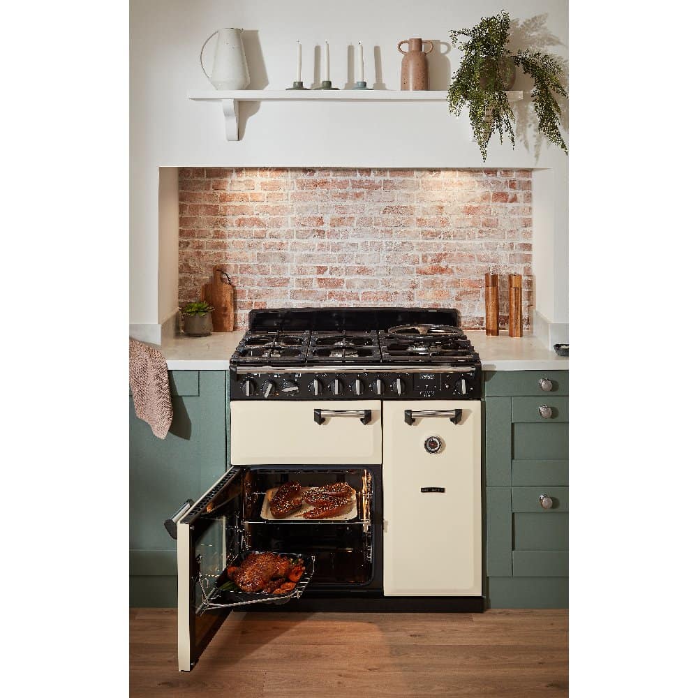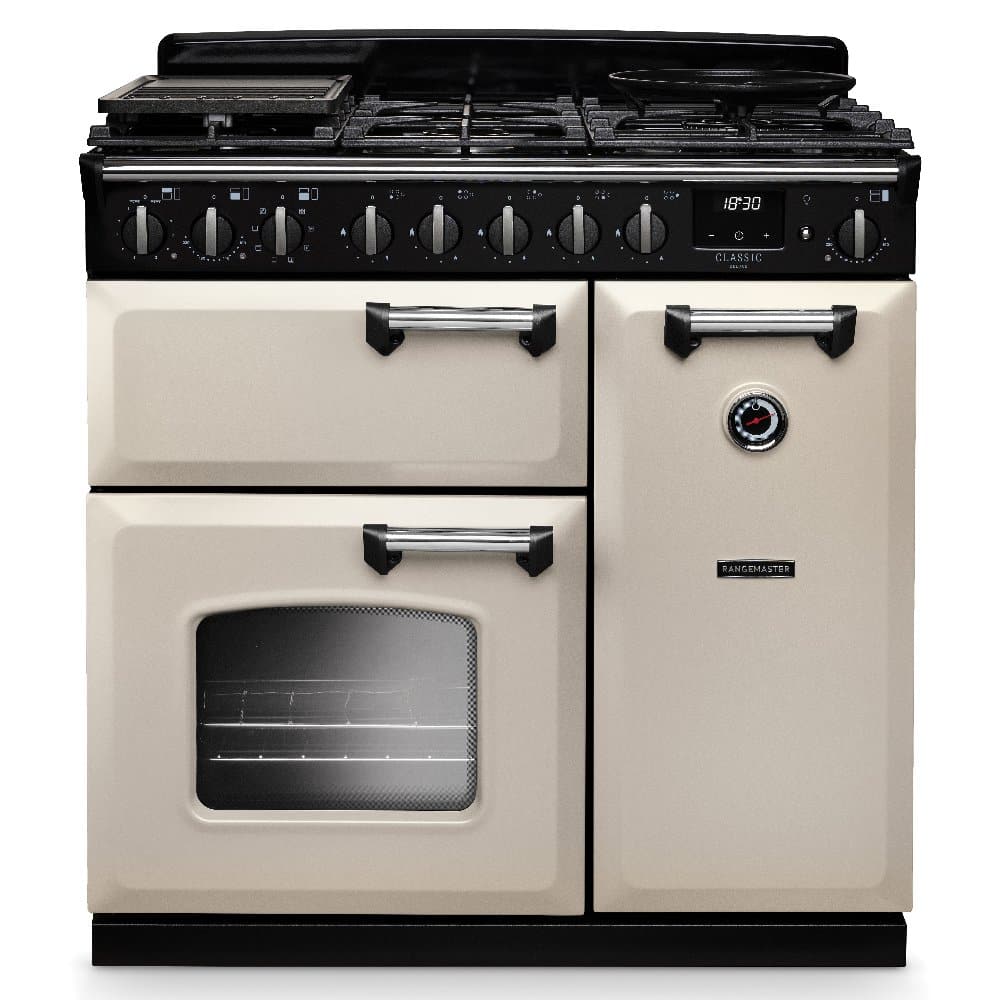 Classic Deluxe 90cm dual fuel range cooker in pale cream with chrome trim