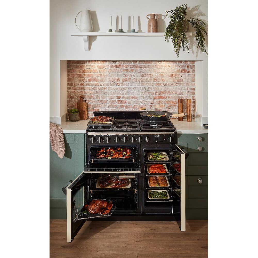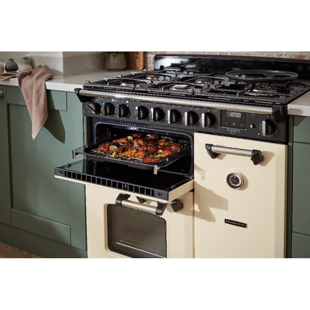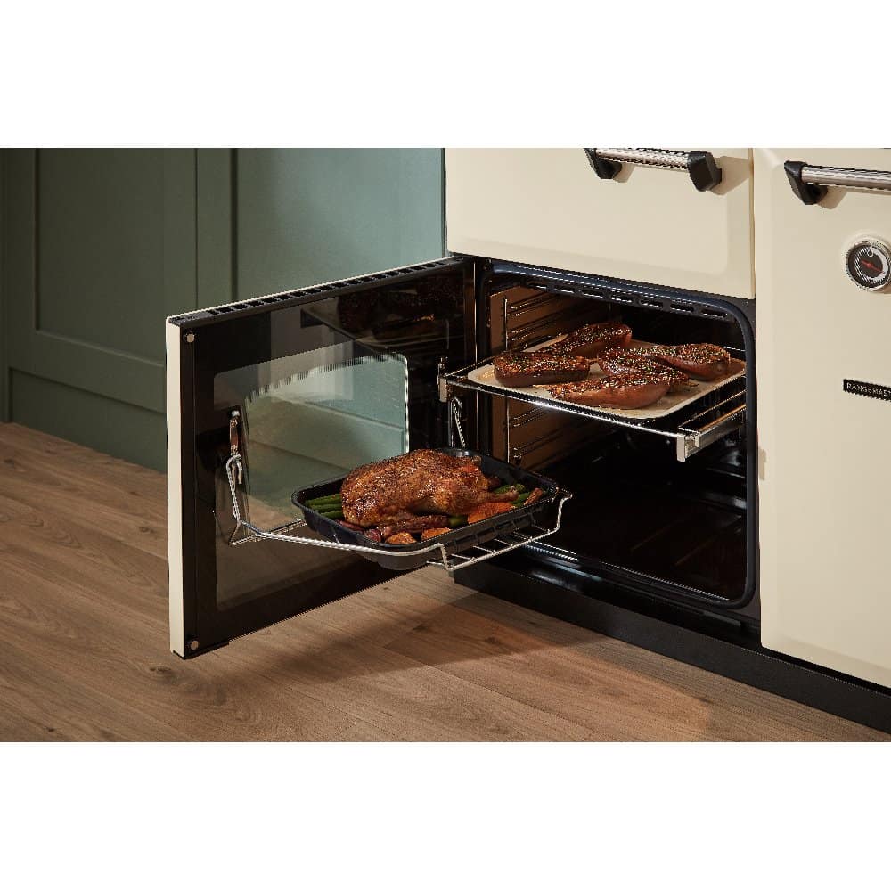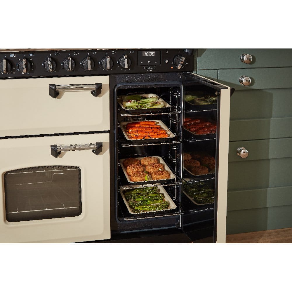 Say hello to the super-sleek Classic Deluxe range cooker with loads of features to enhance your cooking experience. Featuring a main multifunction oven, a tall electric oven, a smooth action glide-out grill and a five burner hotplate you’ll have all you need to cook up a feast. Plus with great added extras like the handy rack, you’ll find roasting meat a breeze. The rack is located on the inside of the oven door, making it easy to check and baste your roast to perfection. Finished in pale cream with chrome trim this model is bound to make a statement in your kitchen.