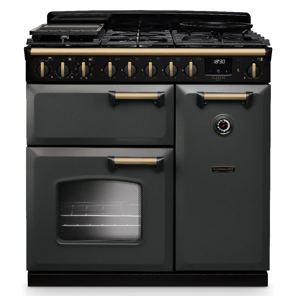 Rangemaster CLDL90DFPSLT/AB1 Classic Deluxe 90cm Dual Fuel Range Cooker Antique Brass Trim 18257 – SLATE