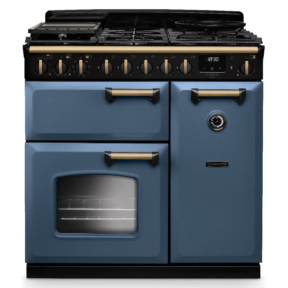 Rangemaster CLDL90DFPSTB/AB1 Classic Deluxe 90cm Dual Fuel Range Cooker Antique Brass Trim 18259 – STONE BLUE