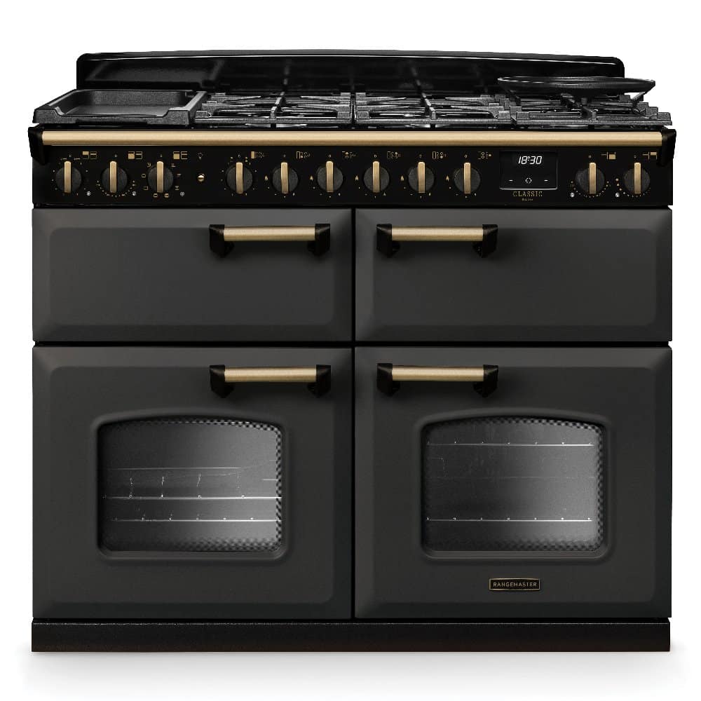 Classic Deluxe 110cm dual fuel range cooker with balanced ovens in slate with antique brass trim
