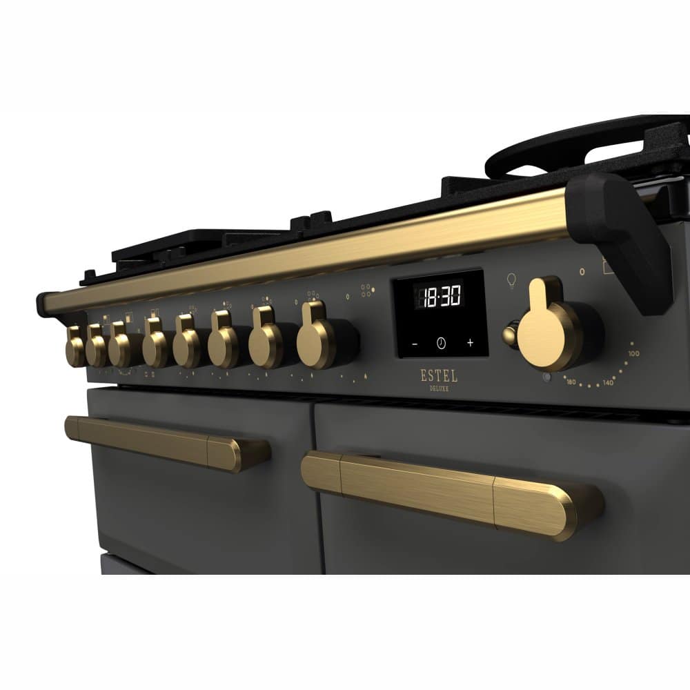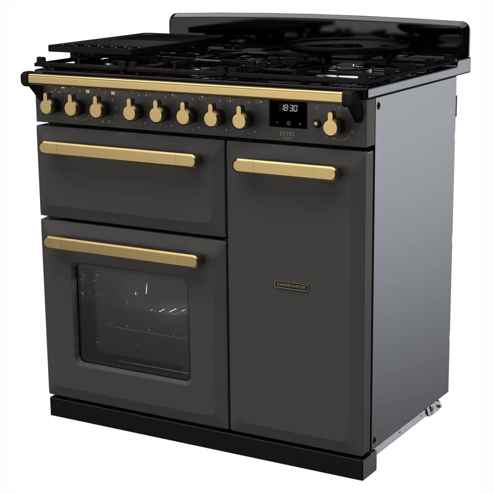 Rangemaster ESDL90DFPSLT/AB1 Estel Deluxe 90cm Dual Fuel Range Cooker With Antique Brass Trim 18033 – SLATE