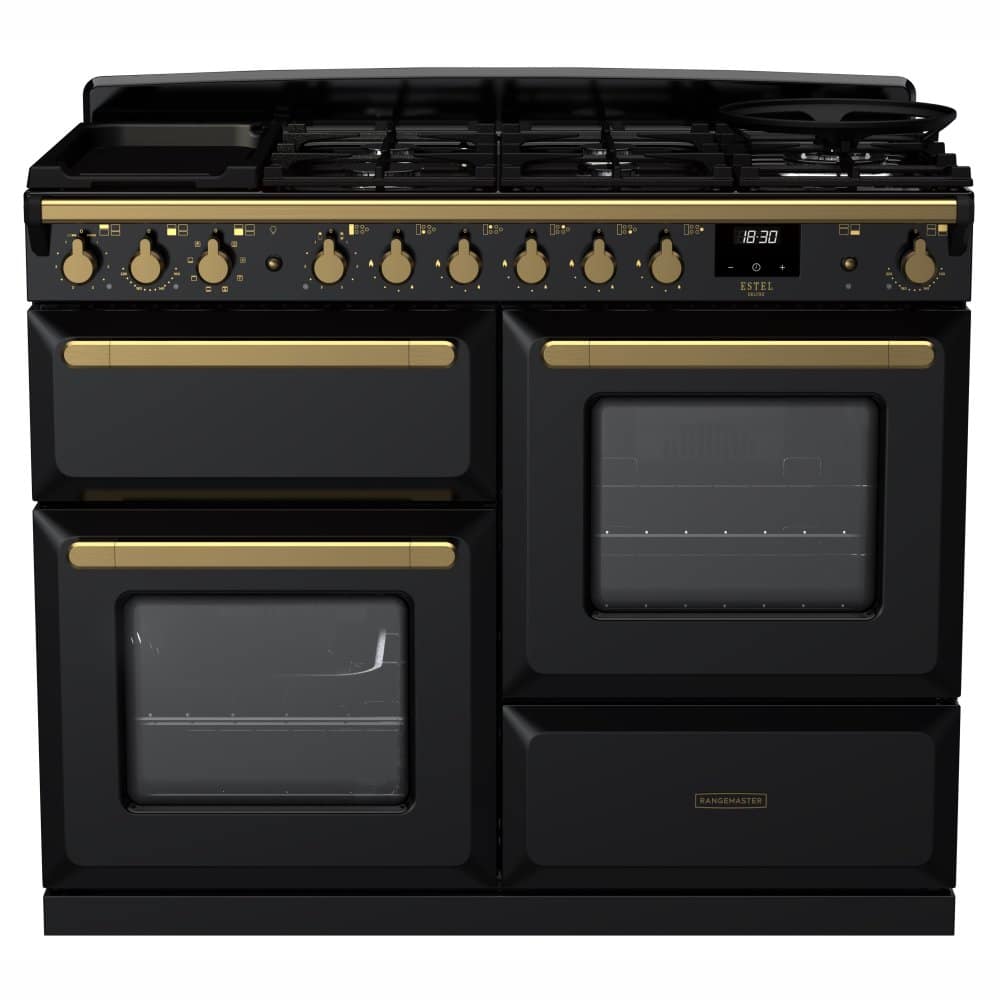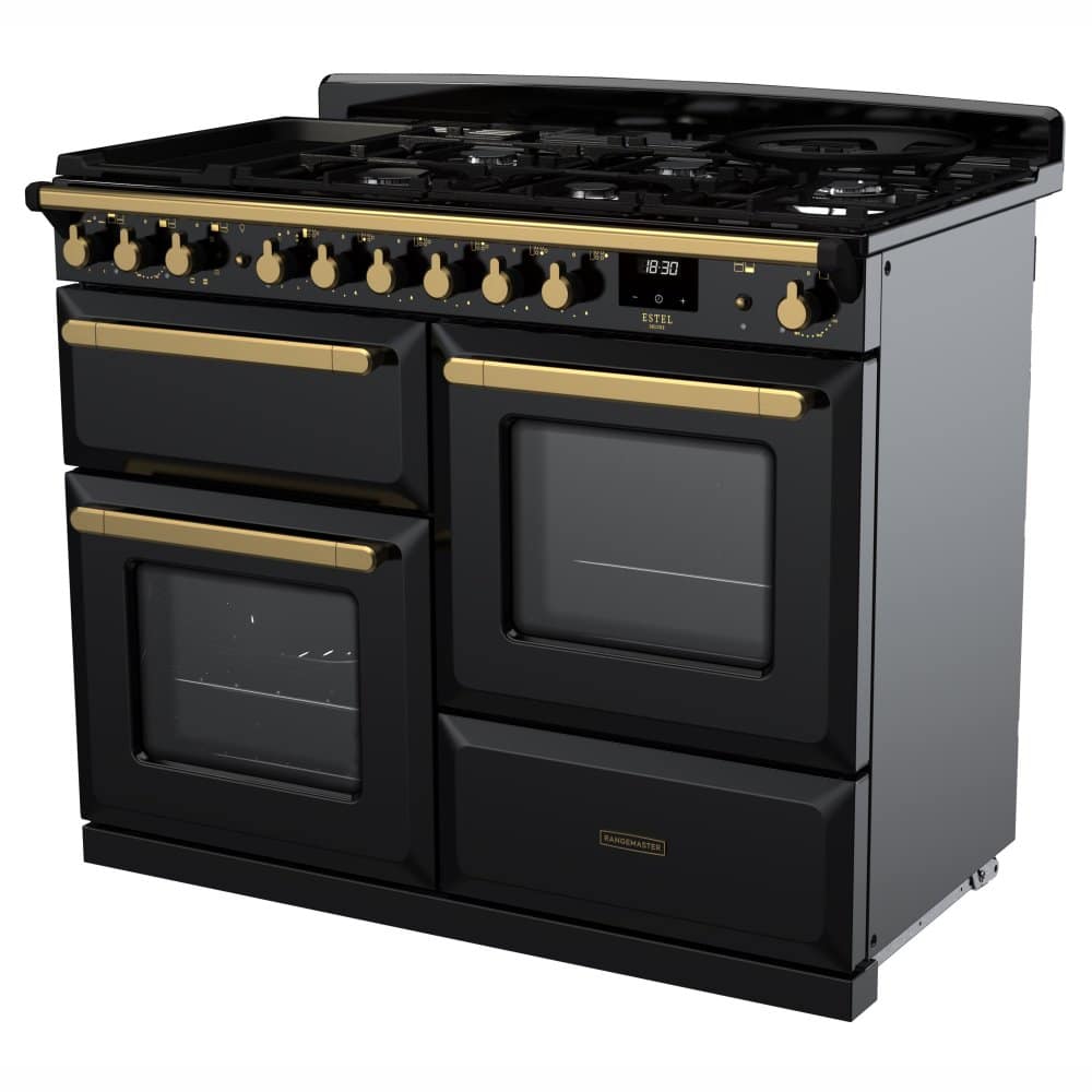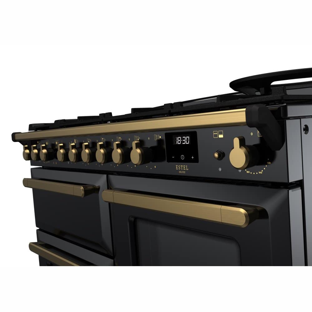 Rangemaster ESDLO110DFPGBL/AB1 Estel Deluxe OC 110cm Dual Fuel Range Cooker With Antique Brass Trim 18102 – BLACK