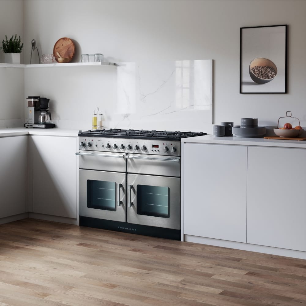 This attractive 110cm wide range style cooker from Rangemaster features a 6 burner gas hob, 2 electric fan ovens and a separate grill and slow cooker. Finished in black it will create a stunning focal point in your kitchen. The energy efficiency rating on this model is A/A and it comes with a two year parts and labour warranty as standard.