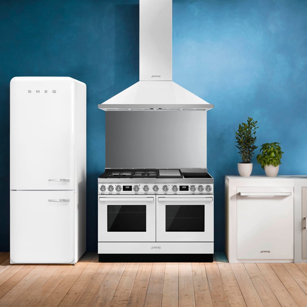 This 120cm wide Portofino range cooker from Smeg really has presence. With two electric ovens, one featuring pryolytic cleaning, and a mixed fuel hob with three gas burners and two induction zones there’s so much space and flexibility you will be able to cook all your favourites. Finished in white it really oozes style, a stunning focal point in your kitchen.
