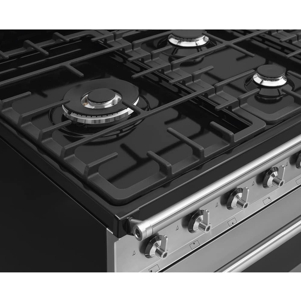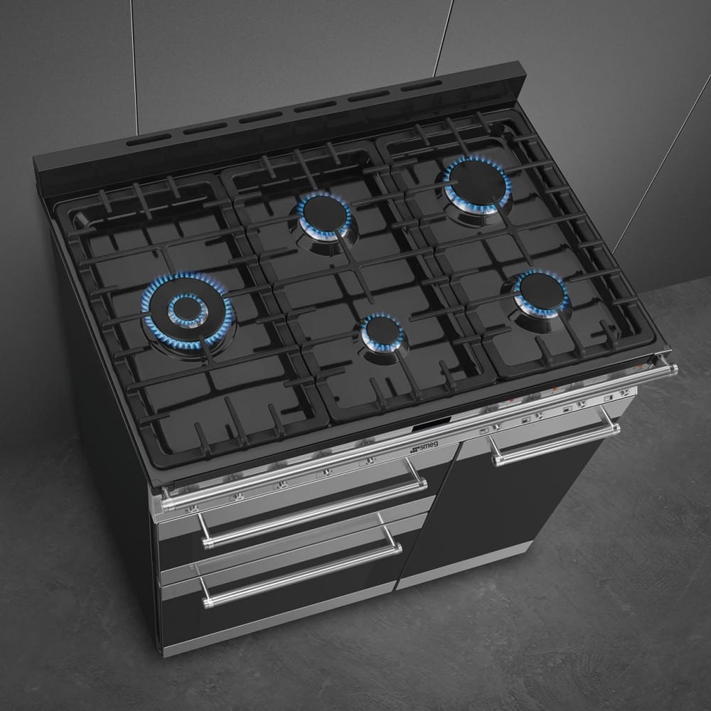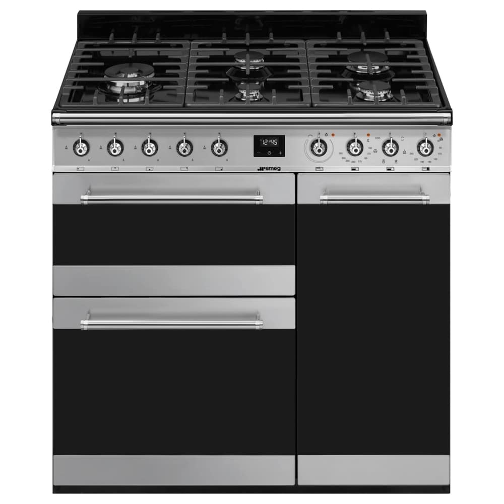 This attractive 90cm wide range style cooker from Smeg features electric ovens and a five burner gas hob. Finished in stainless steel with Eclipse glass it will create a stunning focal point in your kitchen.
