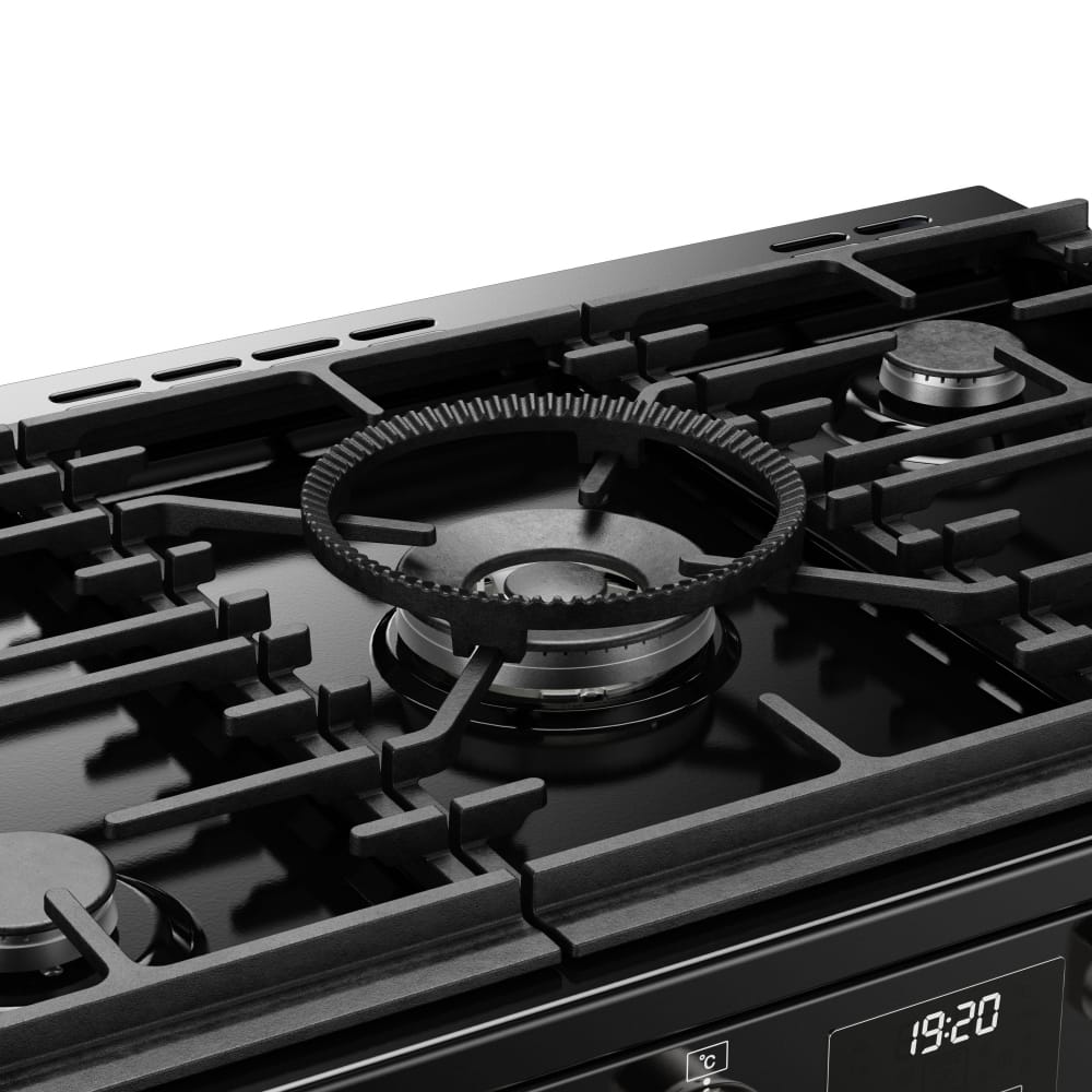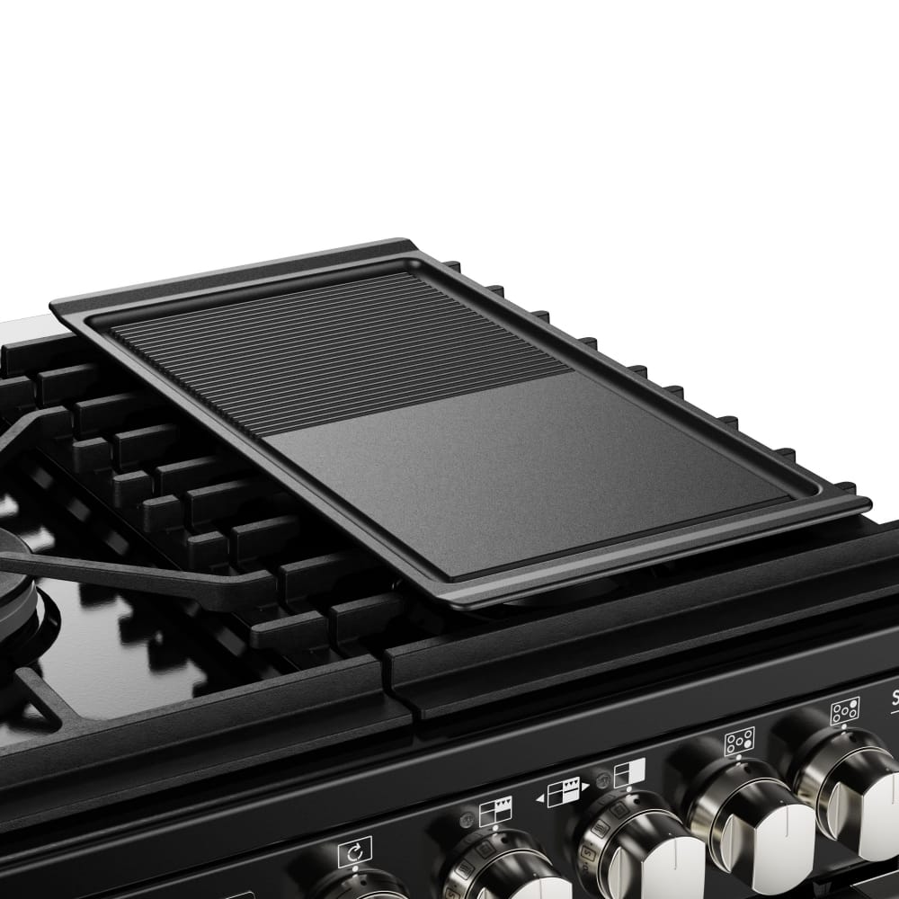 Stylish and functional, this fantastic Sterling Deluxe range cooker from Stoves certainly ticks all the boxes. The fantastic “Titan” tall oven offers an astounding 80 litres of capacity, and using the Pro Flex system, this can be divided into two compartments for great flexibility. The brilliant main oven offers 13 cooking functions and with a separate grill compartment you are spoilt for choice! When you can’t reach the front of the cooker you can check the timer with Zeus bluetooth connectivity, perfect if you are busy in another room. Using the Steam & Infuse cooking system, you can make tasty and healthy food by popping the ingredients in the supplied dish. Finished in black with mirror glass it will turn heads in your kitchen. The doors feature mirrored glass panels.