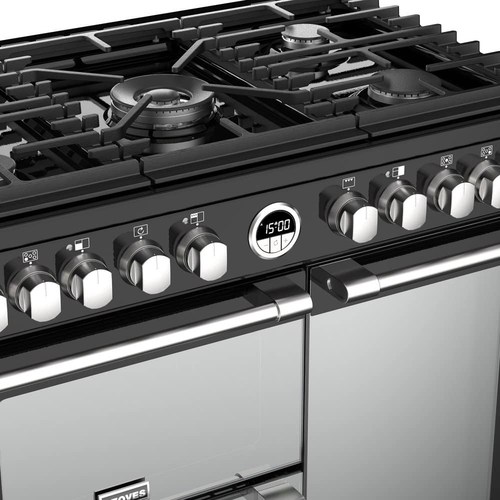 This Stoves 90cm range cooker looks brilliant with its mirrored doors and black finish and is sure to make a fantastic focal point in your kitchen. Boasting a multifunction main oven with 13 functions, including bread proving and pizza, you can release your inner baker! The huge capacity “Titan” tall oven is astounding, with 87 litres of space, ideal for fitting in roast dinners! Topped with five gas burners, including the impressive Power Wok for intense heat, there’s plenty of room for all your pans. The doors feature mirrored glass panels.