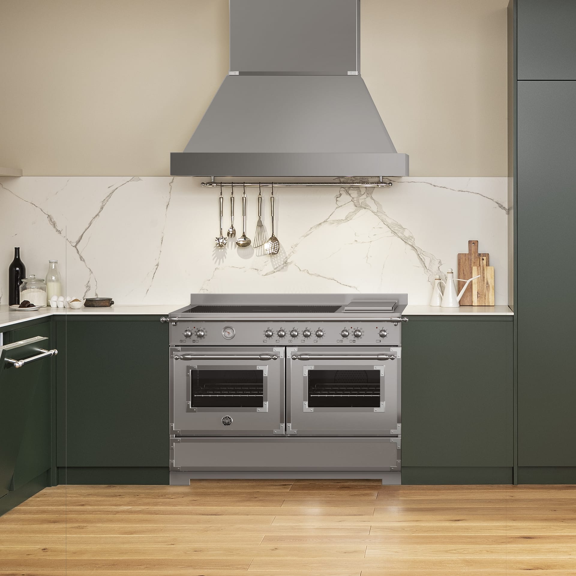 Enjoy a classic appearance with all the best functions and features of a modern range cooker with the Bertazzoni Heritage collection. Measuring 120cm wide, this striking range cooker is finished in stainless steel. Both ovens are multifunctional and have a 69 litre capacity. You can roast, bake and grill at the same time as boiling or frying using the five induction zones on the hob. This range cooker also features a stainless steel griddle; the cooking options are endless! There are matching appliances available in the Heritage collection so you can create a truly classic look in your kitchen with Bertazzoni.