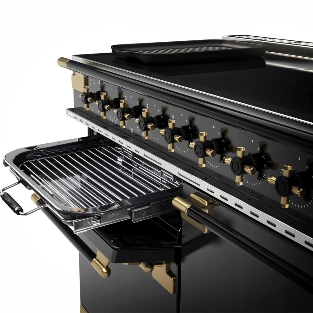 A wonderful combination of style and performance, this 90cm wide Elise Black Edition range cooker from Rangemaster is sure to turn heads while helping you cook up all your favourites. With two generous capacity ovens and a range of cooking functions, including fan, defrost and conventional, whether you are baking, roasting or crisping you will be able to pick the perfect option every time. The five zone induction hob provides clever, modern cooking technology – just pop your pan on the cooking zone, and once it is turned on it will only transfer heat to the pan, much more efficient! Finished in gloss black with antique brass trim, you can certainly make your kitchen the talk of your friends.