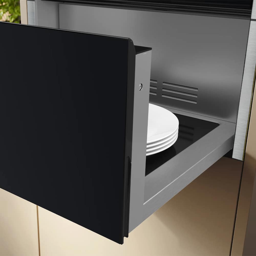 With an astounding 54 litres of space, this stainless steel and black glass warming drawer can fit up to 40 plates! Fantastic for family gatherings or dinner parties! You can warm your dishes and utensils or easily defrost your food, with 4 different temperature settings. The push-pull handleless opening mechanism gives a modern appearance, which fits perfectly with other Neff items from across the range.