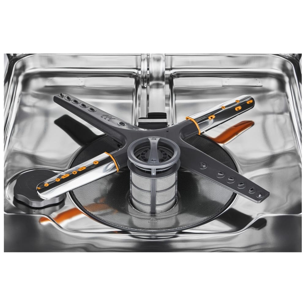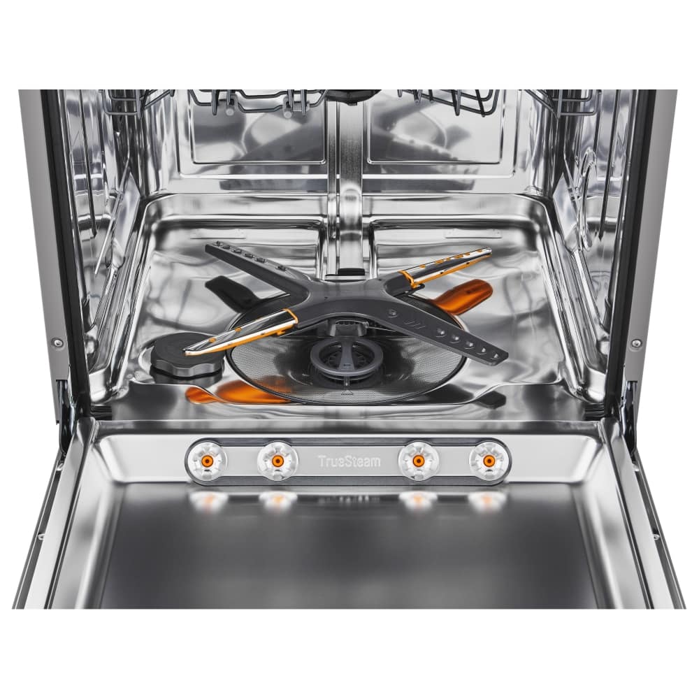 This superb freestanding QuadWash dishwasher from LG offers space for 14 place settings. LG’s QuadWash system features 4 spray arms which give powerful cleaning from every angle, and TrueSteam will remove 99.99% of bacteria, dried-on food and watermarks for a spotless clean. This model has LG’s EasyRack Plus basket system with a height adjustable top basket and a door which opens automatically at the end of the cycle. It is finished in shiny steel and has a noise level of 46 decibels. This unit is designed to fit under your worktop and will require a cold water feed and a waste outlet.