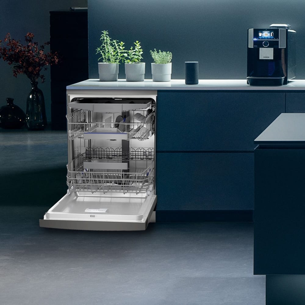 This superb freestanding dishwasher from Siemens offers a total of 6 programmes and space for 13 place settings. It is finished in black steel and has a noise level of 44 decibels. This unit is designed to fit under your worktop and will require a cold water feed and a waste outlet. It can be controlled or monitored remotely by phone or tablet using an App with a suitable WLAN connection thanks to the Home Connect function.