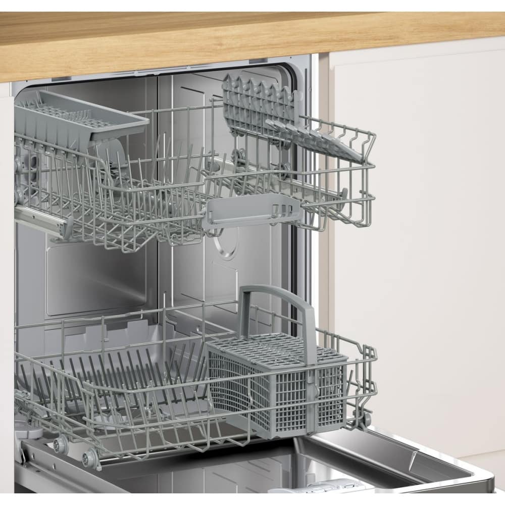 Give your cookware a treat with this Bosch fully integrated dishwasher, the perfect way to keep your dishes sparkling. With 13 place settings, a cutlery tray and plenty of space for all sorts of cookware, the SMH4HTX02G certainly won’t let you down. Transform your cleaning routine with 6 different wash programmes designed to treat all sorts of crockery with the appropriate care. Want to speed up your dishwashing? Combine your preferred programme with the SpeedPerfect+ option to reduce cycle times by up to 66% without compromising on performance. Thanks to VarioHinge, the door front is pushed upwards slightly when opening the appliance. This negates the need for a cut out in your plinth and also allows for shorter plinth heights. Want to know more about the effects of appliances on energy usage? Just use the Bosch Home Connect app! Control when your cycle starts to avoid using energy at peak times and gain an insight into the estimated water and energy consumptions of each wash. Look out for the environment and your bank account.