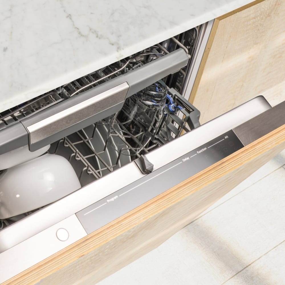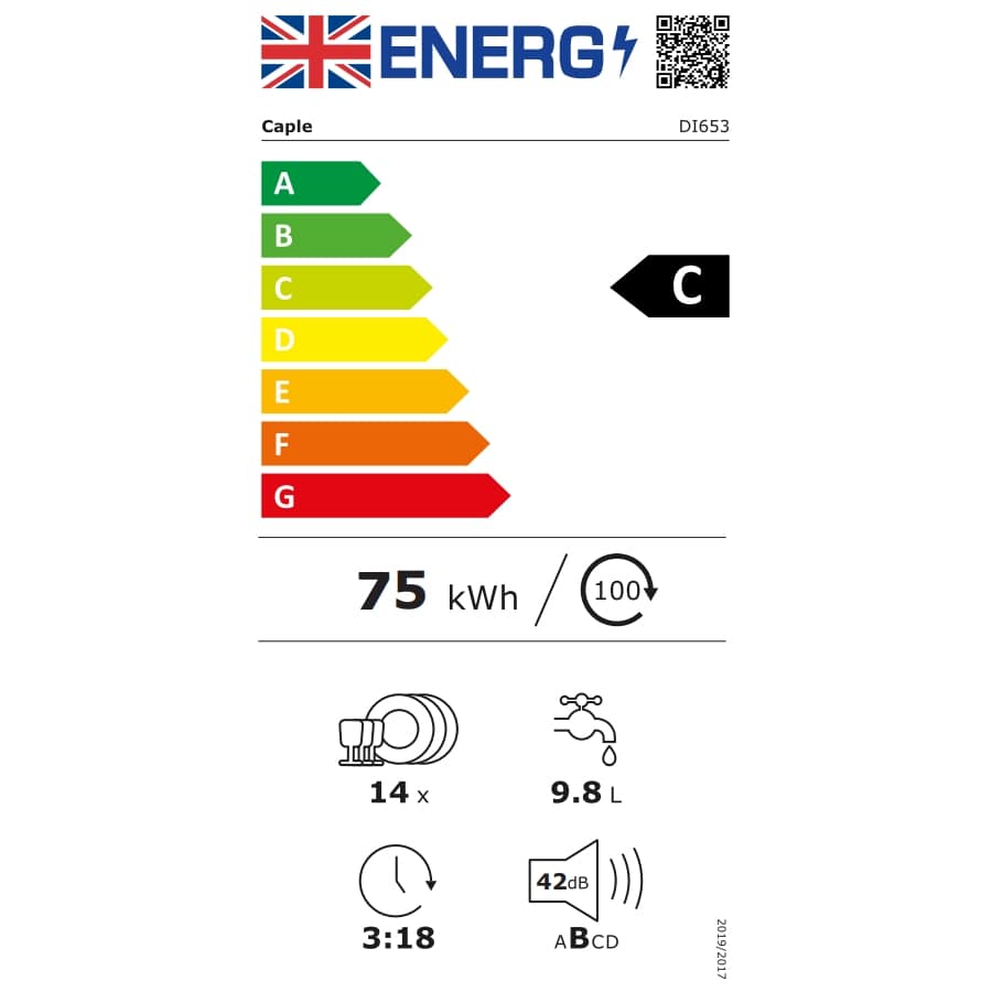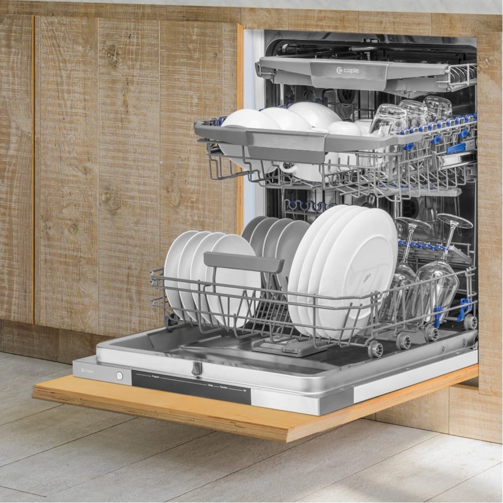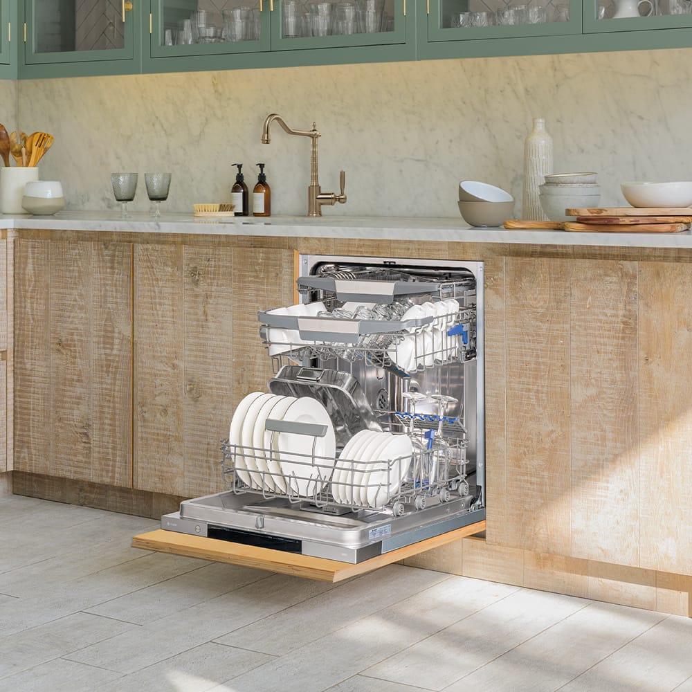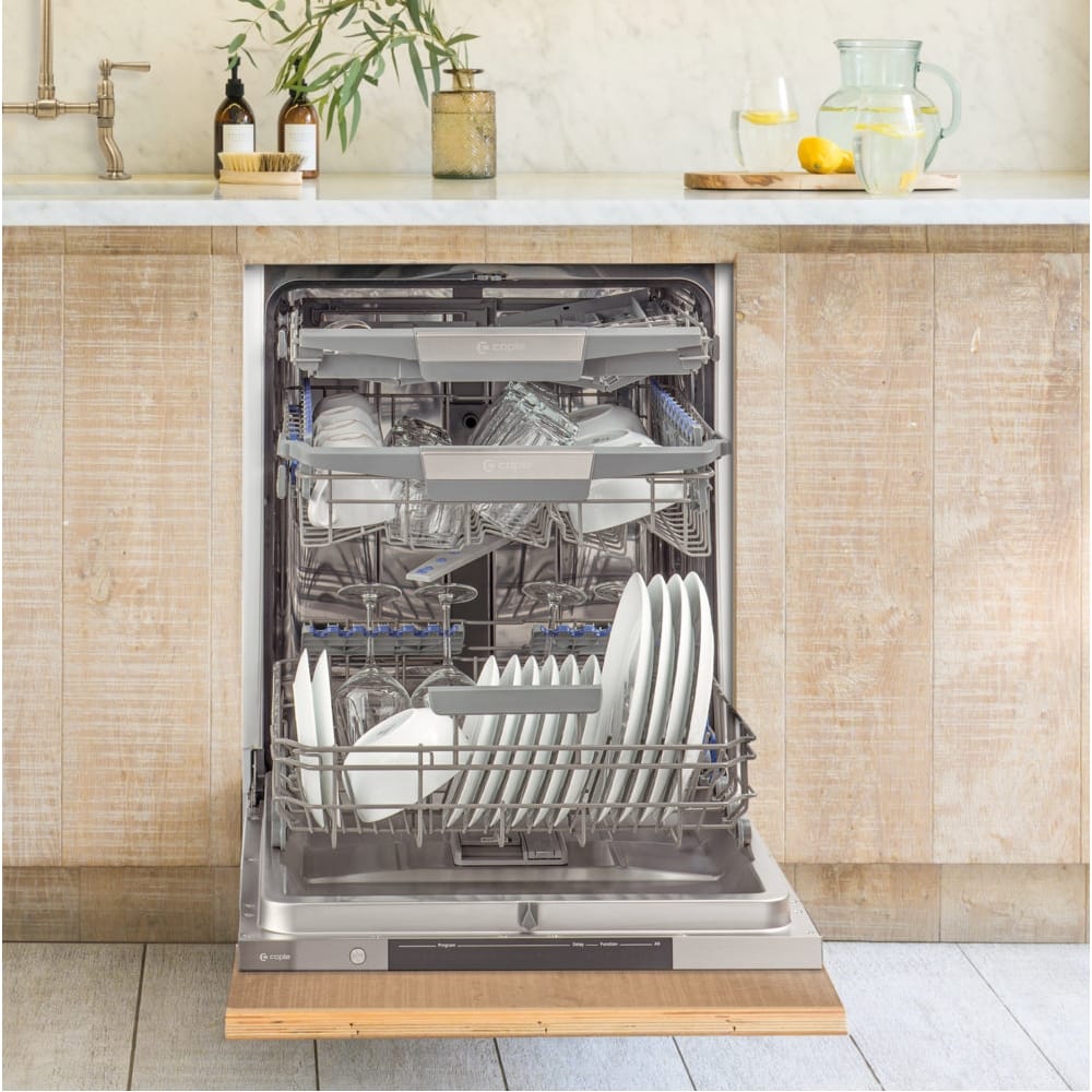 This integrated dishwasher provides plenty of space, with room for 14 place settings and a cutlery tray. There are 7 programmes to choose from, from the economy wash to the hygiene programme, particularly handy for baked on food. As it can be installed behind a furniture door, it won’t interrupt your streamlined kitchen design.