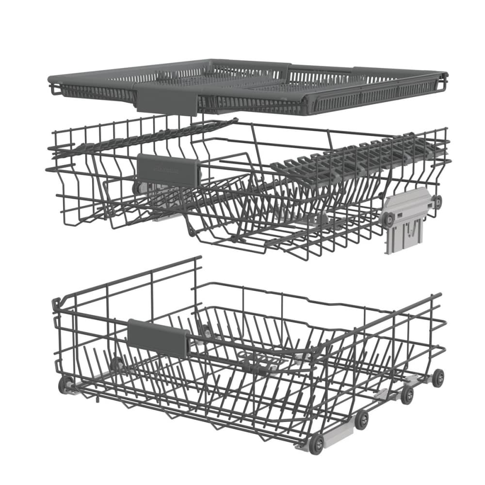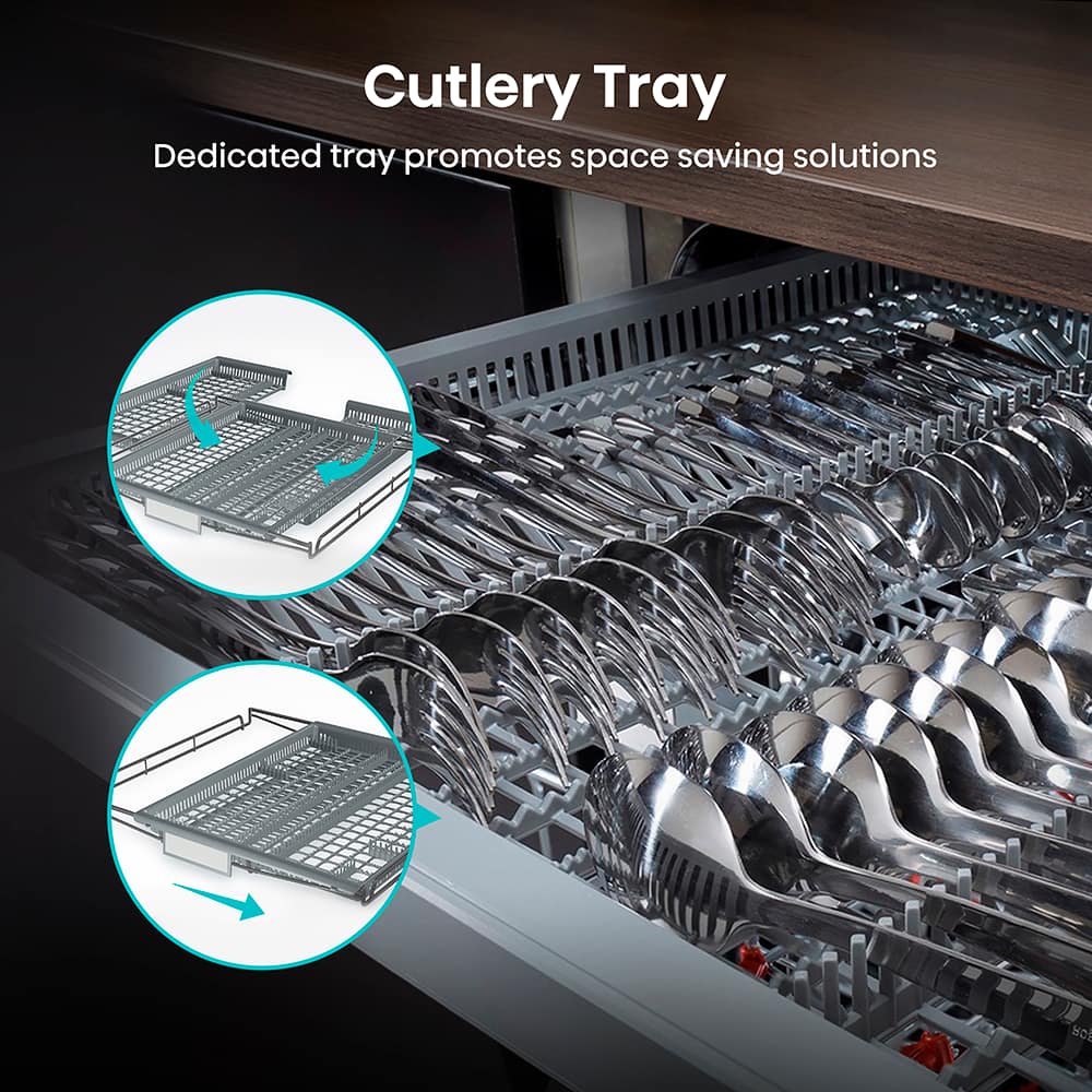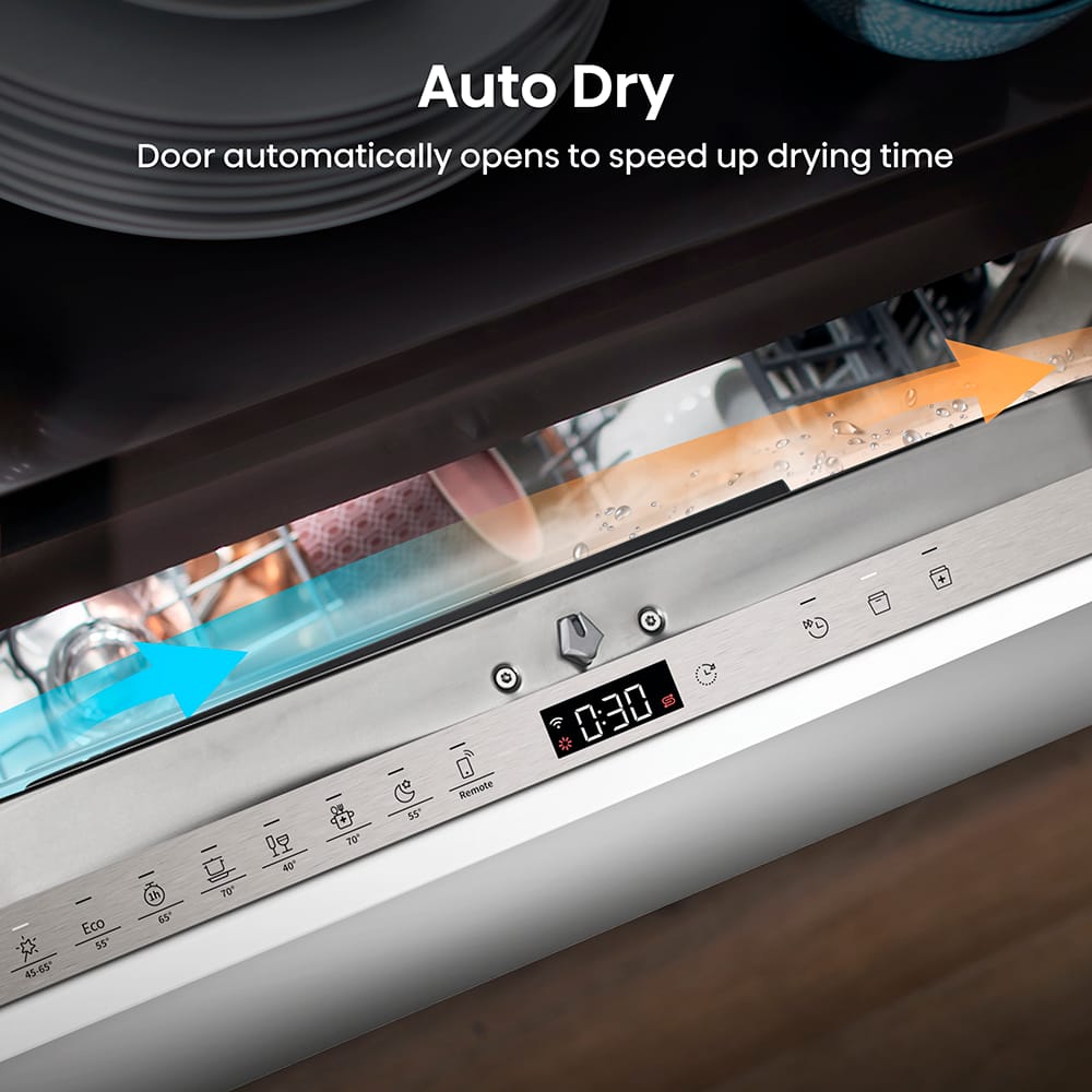 This integrated dishwasher from Hisense provides plenty of space, with room for 16 place settings and a cutlery tray. There are 7 programmes to choose from, from the economy wash to the intensive programme, particularly handy for baked on food. As it can be installed behind a furniture door, it won’t interrupt your streamlined kitchen design. This model features the Status light which shines on the floor to show when the programme has finished.