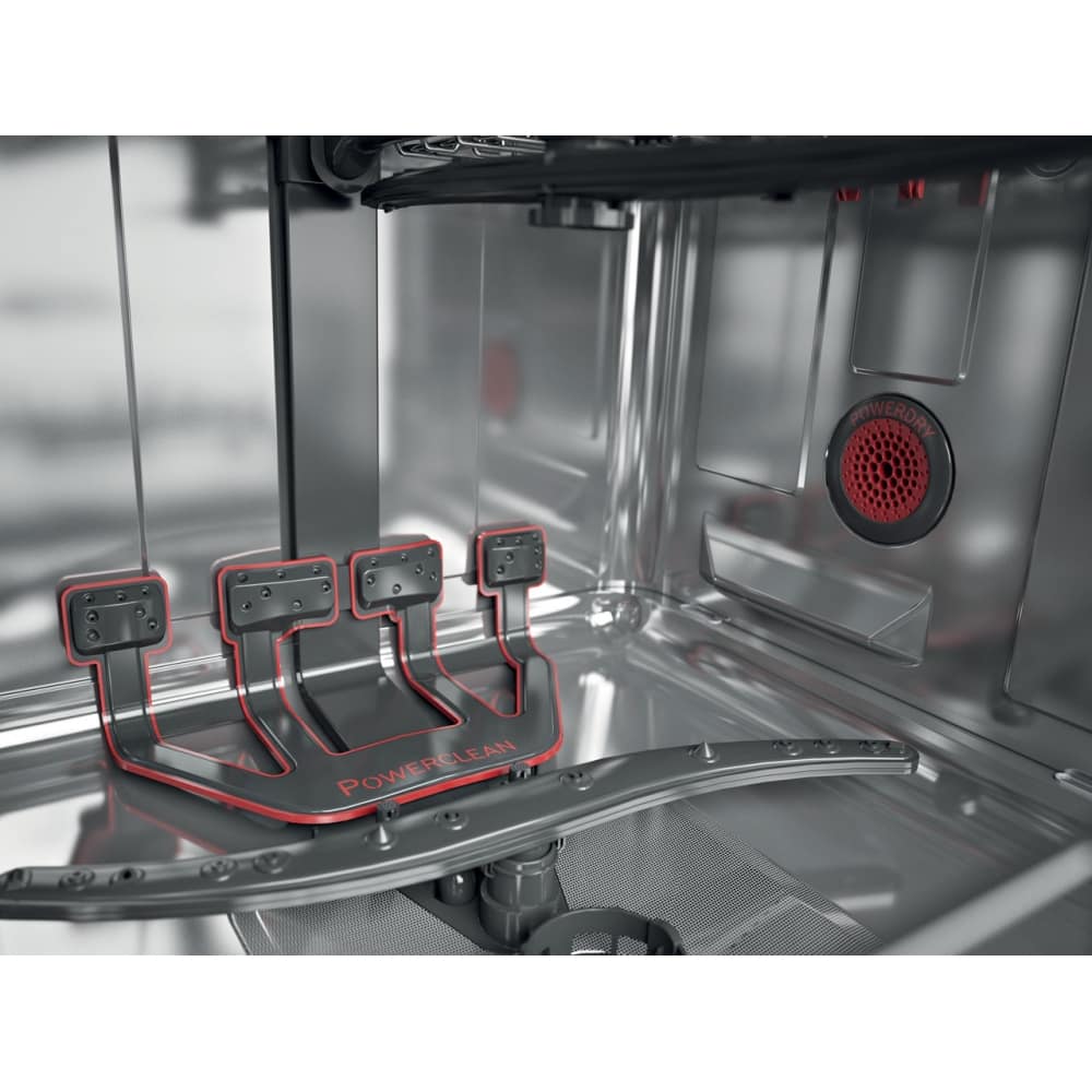 The Whirlpool WIO3O33DELUK built in Supreme Clean dishwasher has space for 14 place settings and an A+++ energy rating. 6th Sense technology detects the level of dirt and optimises the washing cycle, saving up to 50% on energy, water and time, ensuring great results every time. Achieve outstanding cleaning and drying results in just one hour thanks to the PowerDry system; steam is extracted and transformed into water that is drained away to leave the dishwasher free from humidity when you open the door. PowerClean offers superior cleaning performance to conventional dishwashers, using additional sprayers with powerful jets to reach every corner of the dishwasher.