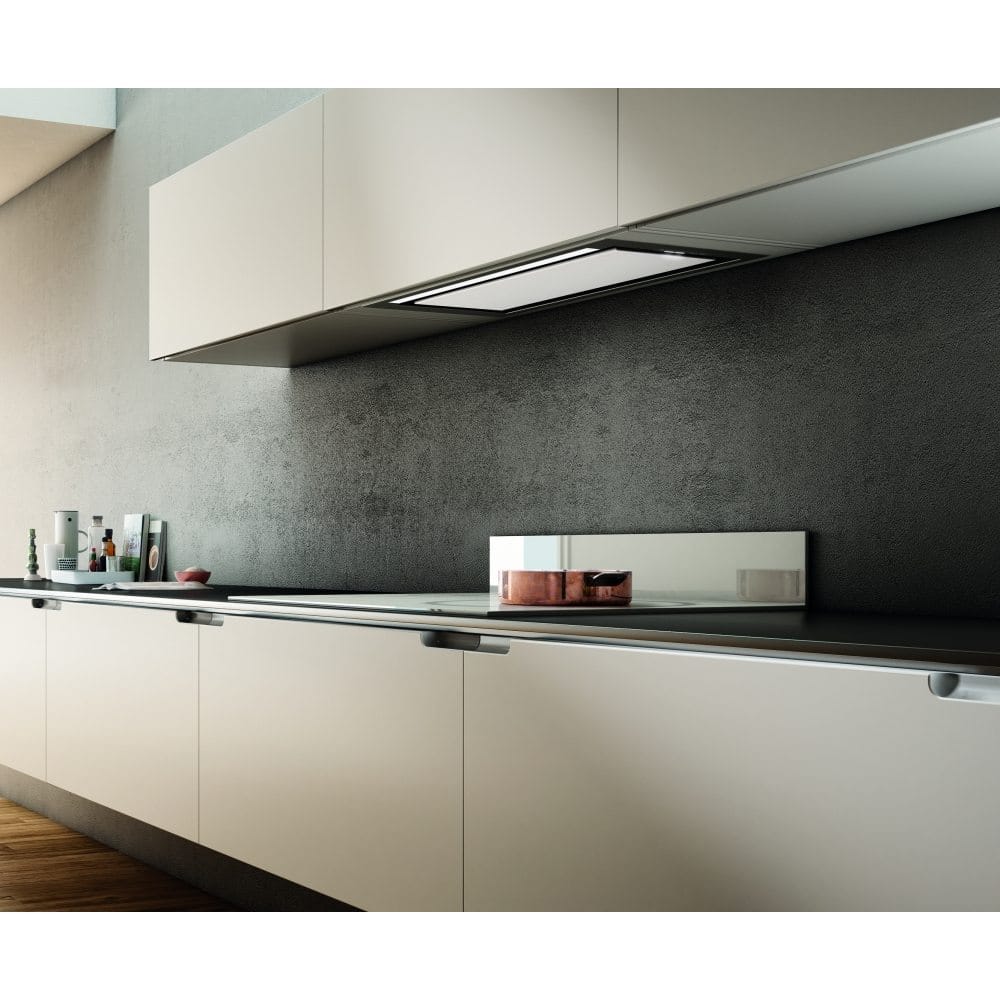 This built in canopy hood from Elica is 71cm wide, finished in stainless steel and white glass and has a maximum extraction rate of 700m³ per hour.