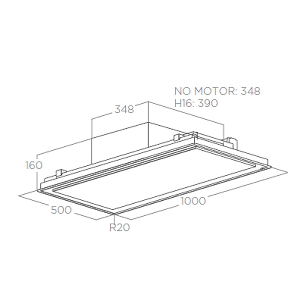 This built in ceiling extractor from Elica is 100cm wide and has an extraction rate of up to 720m³ per hour. The stainless steel frame holds custom fabricated panels designed to fit your ceiling decor. It is designed for ducted extraction but can be converted to recirculation with a recirculation kit. This model features a low height motor allowing installation within confined ceiling spaces.