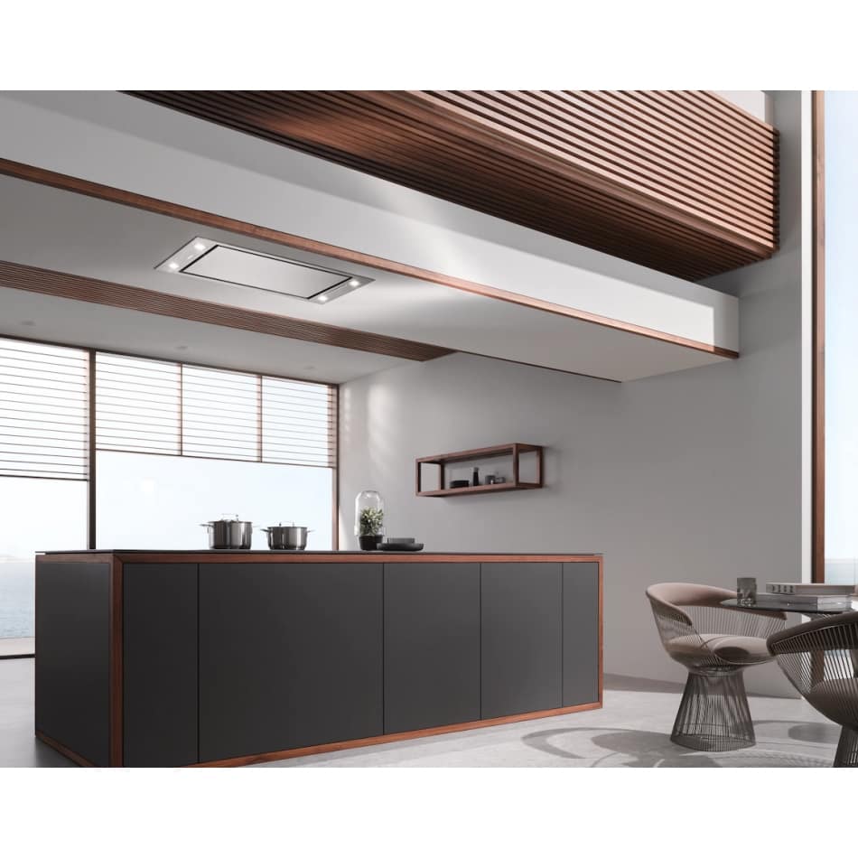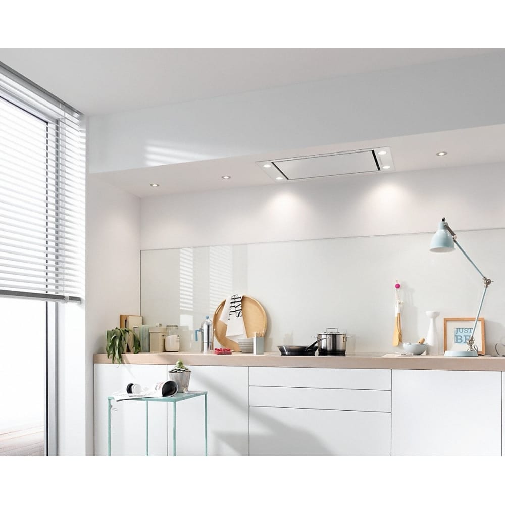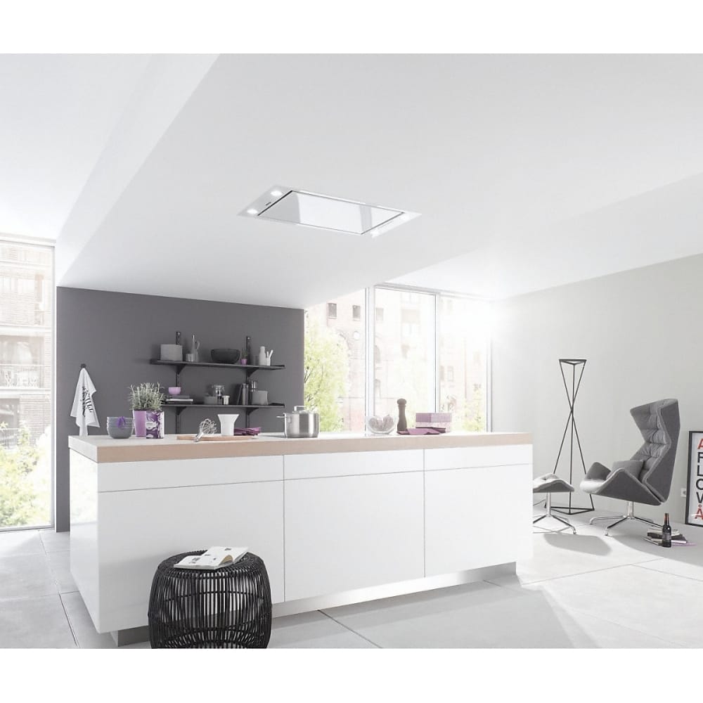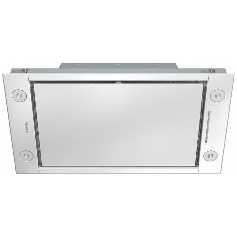 This built in ceiling extractor from Miele is 90cm wide, finished in white and has an extraction rate of 450m³ per hour. It is suitable for ducted extraction or recirculation using optional charcoal filters and comes equipped with dimmable LED lighting.