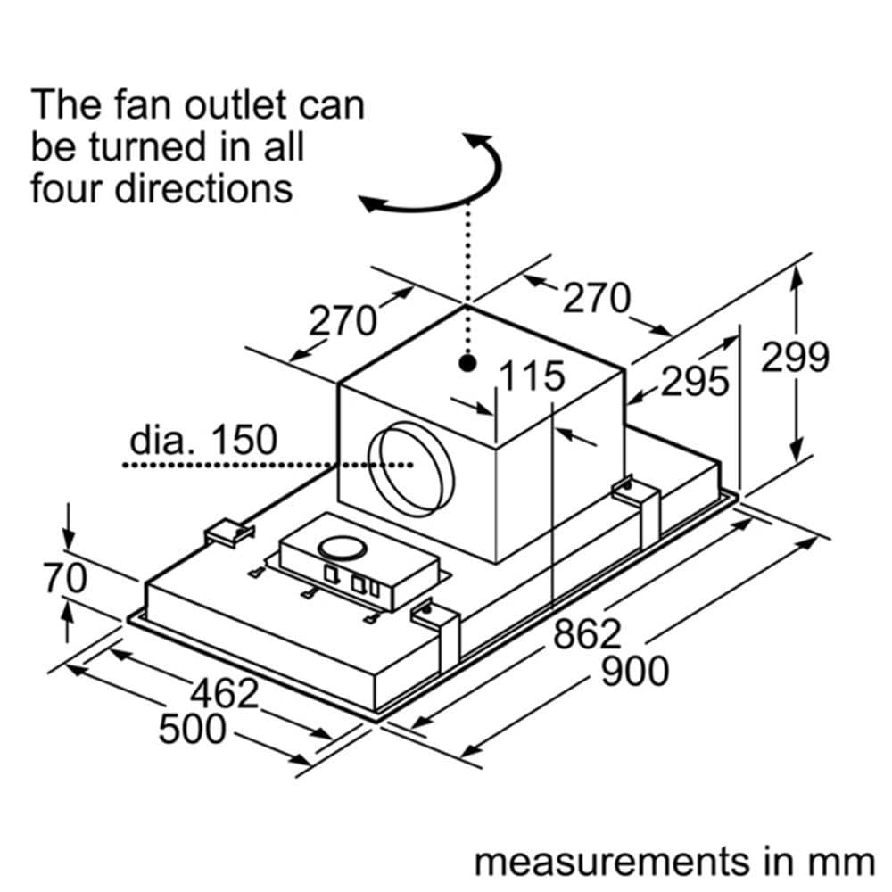 No kitchen is complete without a sleek ceiling extractor. The Neff I99C68N1GB 90cm ceiling hood is perfect for the job! This stunning stainless steel island canopy hood from Neff boasts a superb 570m³ per hour extraction rate. Designed to be ducted through an outside wall this model is perfect for recirculation as well. Arriving with 3 speeds plus intensive, an LED display and LED lights it’s a perfect complement to any kitchen.