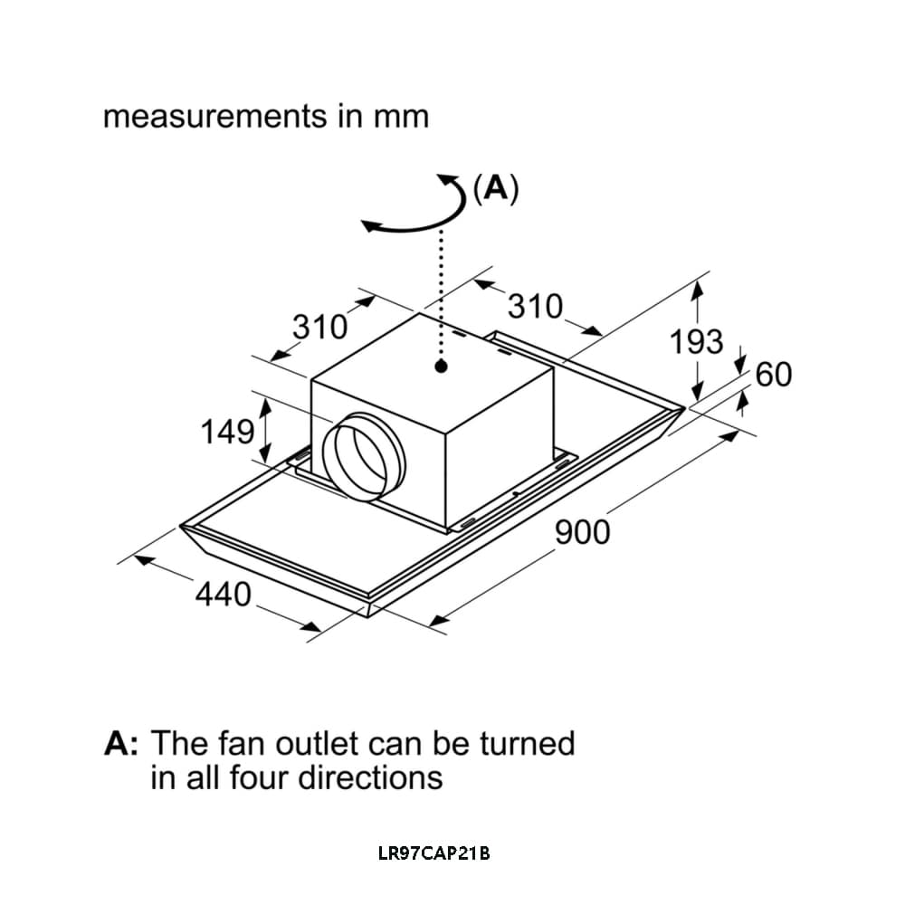 Hidden away in your ceiling, the brilliant 90cm wide LR97CAP21B will waft away unwanted cooking odours and steam easily and discreetly. With a stainless steel and white finish it has a modern appeal and is great for a busy kitchen with an extraction rate of 400m³ per hour and a powerful intensive setting. Easy to use as well, thanks to the handy remote control, it is suitable to be installed with ducting or using a recirculation kit. This model features a rotatable compact motor for installation between joists.