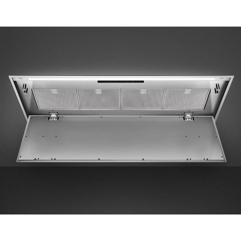 A high performance built in ceiling extractor by Smeg, this stainless steel model is 120cm wide and has an impressive extraction rate of 447m³ per hour. Suitable for ducted extraction or recirculation with an additional recirculation kit, this Smeg ceiling extractor would be a welcomed addition to any home.