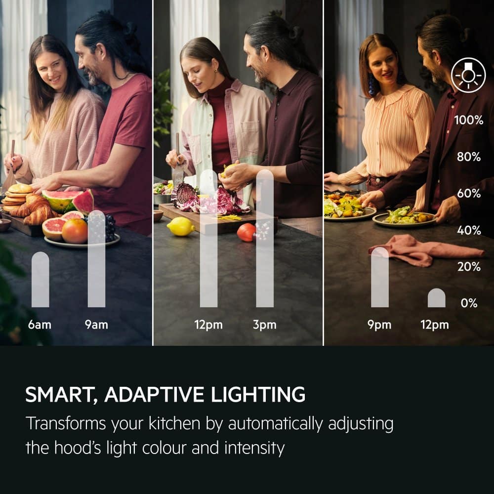 Offering extraction rates of 445m³ per hour, with three speed settings plus two intensive settings and automatically adjusting LED lighting, this 90cm wide matte black angled chimney hood offers fantastic performance, removing steam and cooking odours with ease. Brilliantly styled, with a modern look, the NDV8791CT will certainly turn heads in your kitchen. Designed to be ducted externally, this model can be used in recirculation mode through the use of charcoal filters.
