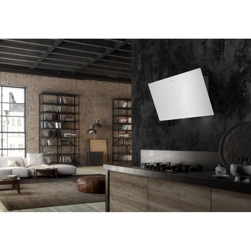Treat your kitchen to impeccable sharp lines and powerful extraction with this stunning 80cm angled glass cooker hood from Faber. Adding an element of sass and style the Tweet will look superb on any modern kitchen wall. Eliminate odours and steam at the touch of a button, with 3 speed settings including intensive for ultimate extraction power. Finished in white glass and supplied with a matching chimney kit, you can choose to duct out or recirculate depending on what suits. LED lights illuminate the area beneath the hood, and removable dishwasher safe grease filters mean you can clean your hood easily. Perfect!