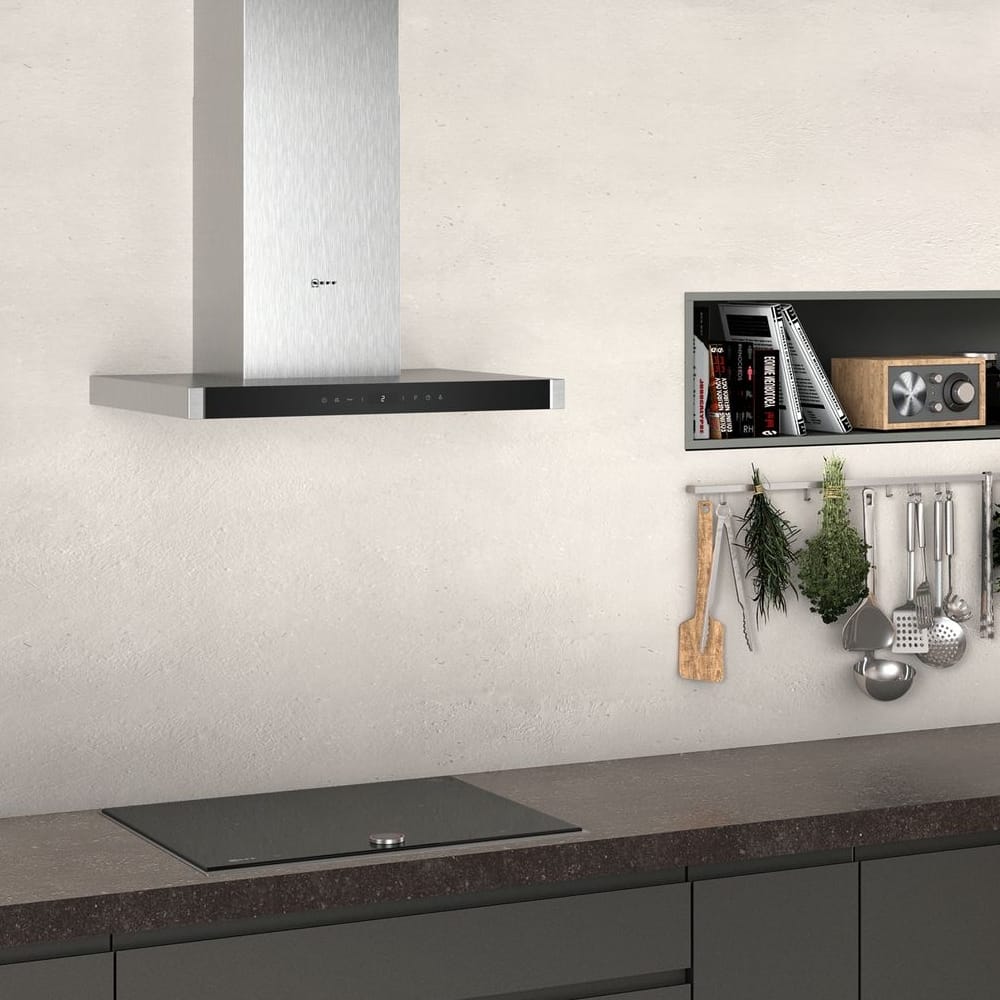This fantastic 60cm chimney hood from Neff really provides fantastic performance with great style. With an impressive extraction rate of 410m³ per hour, three speed settings and two intensive modes you can keep cooking while it whisks away cooking aromas and steam. Look out for the dimmable soft lights and the handy filter indicators. With the option to recirculate using charcoal filters or duct outside, there are flexible installation options available as well.