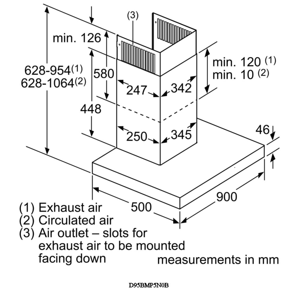 Stylish with its stainless steel and black glass finish, the D95BMP5N0B really makes a focal point in the kitchen. Offering an extraction rate of 420m³ per hour you can carry on cooking, as this chimney style hood makes short work of all the cooking aromas and steam. With three speed settings and two intensive modes, operated with electronic touch controls, you have great flexibility. Bright LED lights are great for checking your cooking, but for when you don’t need the full light there are dimmable soft lights. Designed to be ducted out, this model can also be recirculated using a recirculation kit.