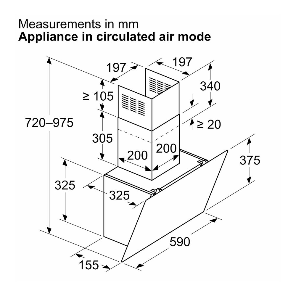 This superb angled chimney style cooker hood from Siemens is 60cm wide and boasts a 430m³ per hour extraction rate. This unit is designed to be ducted through an external wall but can also be operated in recirculation mode with the use of optional charcoal filters. Finished in black glass it will create a real focal point in your kitchen.