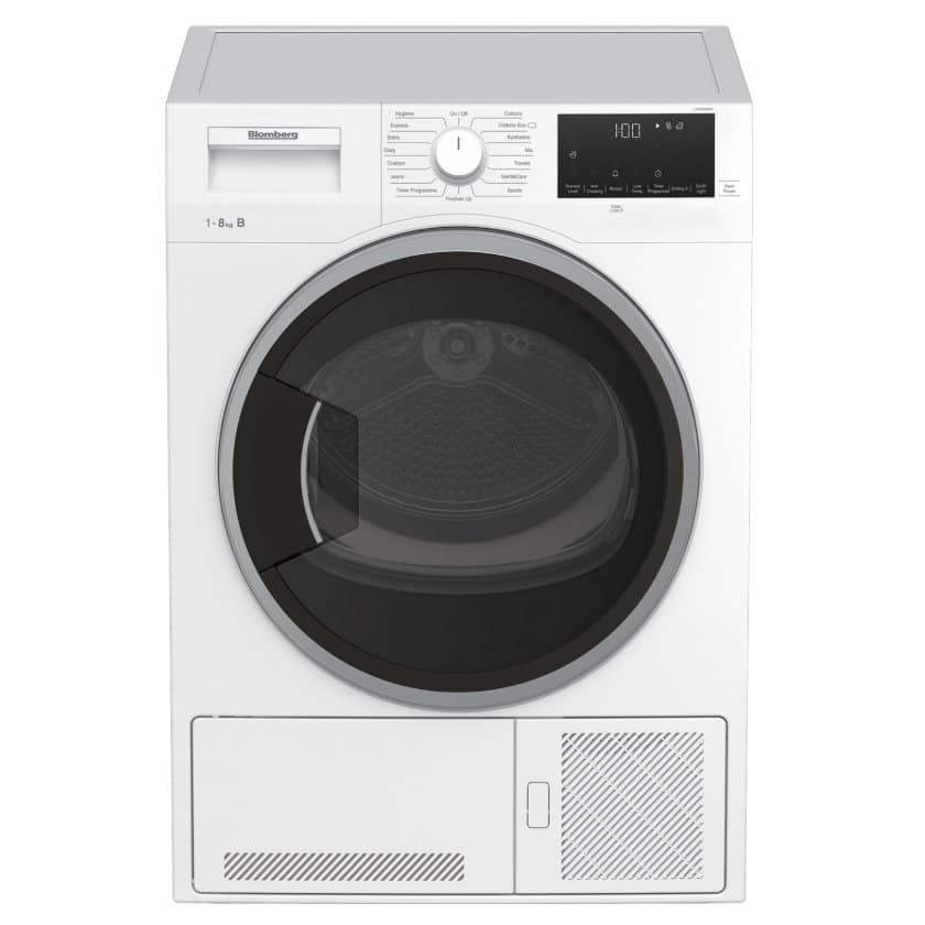 This Blomberg freestanding condenser dryer has an impressive 8kg capacity and is finished in white.