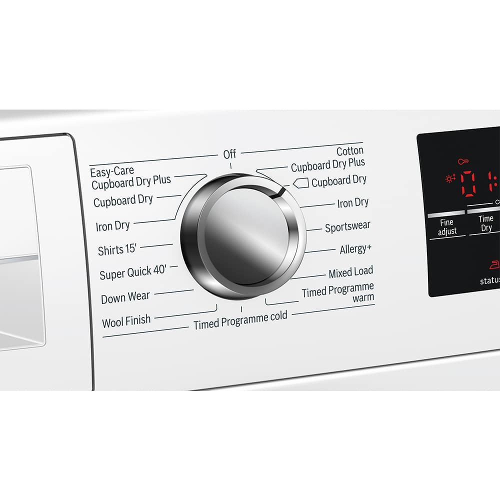 The WTG86402GB from Bosch is a fantastic option for a busy home, as it offers brilliant drying performace combined with handy options such as Anti Crease – who wouldn’t want to spend less time at the ironing board! Fully utilising the Sensitive Drying system by Bosch, it gently pushes warm, mild air over the load while turning using curved, soft carriers. Perfect for delicate items. With Anti-Vibration sidewalls noise is minimised and the Auto Dry sensors detect moisture and ensure that the dryer does not run unnecessarily. Great for saving pennies!